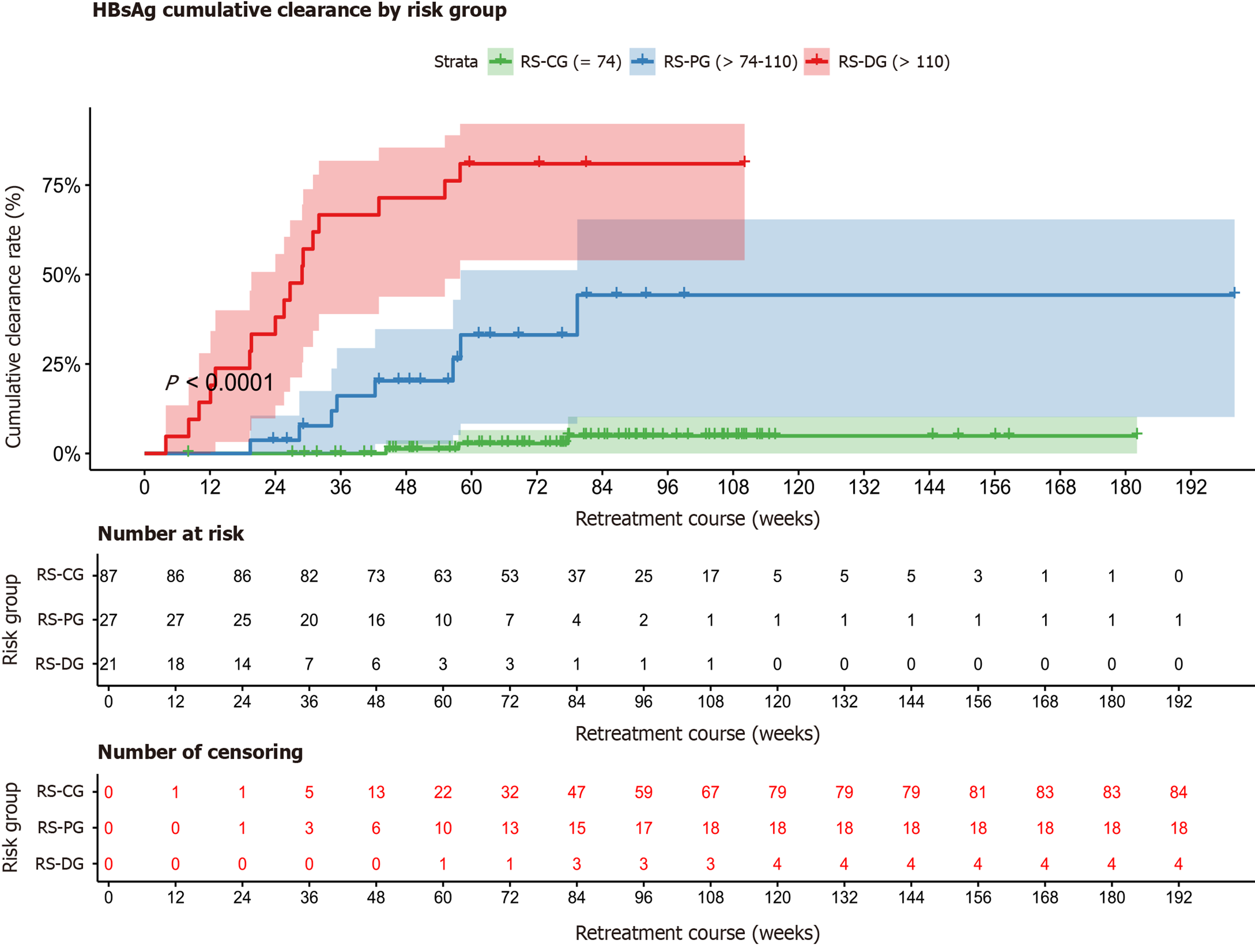 Significantly higher hepatitis B surface antigen clearance rates in retreatment hepatitis B surface antigen clearance prediction score (RHCP-S)-dominant group vs RHCP-S-challenge group [hazard ratio (HR) = 56.72, 95% confidence interval (CI): 16.20-198.63; P < 0.001] and RHCP-S-probable group vs RHCP-S-challenge group (HR = 11.38, 95%CI: 3.01-43.04; P < 0.001), indicating that stratification has strong discriminatory power. All comparisons Bonferroni-corrected. HBsAg: Hepatitis B surface antigen; RS-CG: Retreatment hepatitis B surface antigen clearance prediction score-challenge group; RS-PG: Retreatment hepatitis B surface antigen clearance prediction score-probable group; RS-DG: Retreatment hepatitis B surface antigen clearance prediction score-dominant group.
