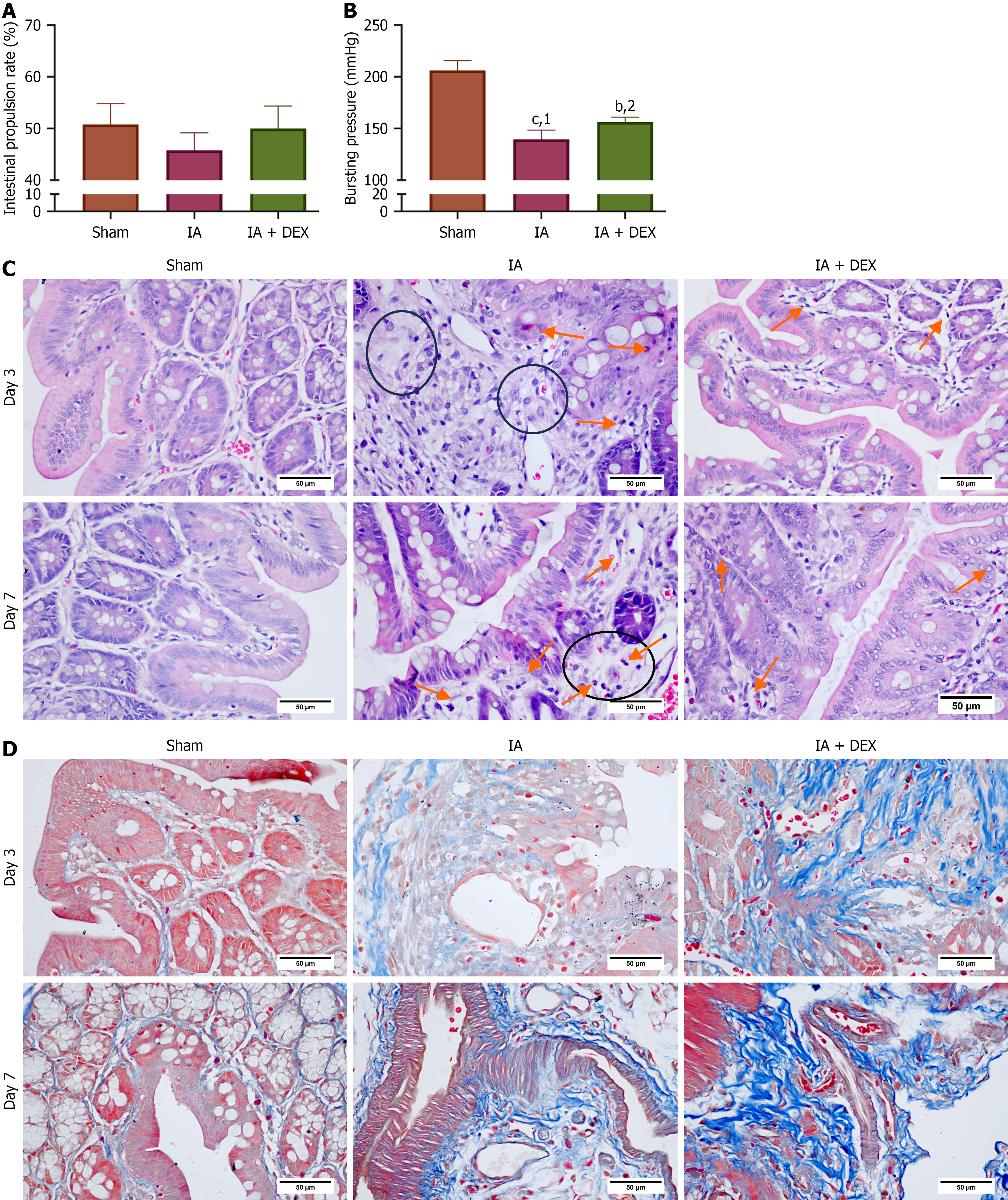 A: Intestinal propulsion rate on postoperative day 6 (n = 6 per group). No significant differences were observed among groups; B: Anastomotic bursting pressure on postoperative day 7 (n = 6 per group); C: Representative hematoxylin-eosin-stained sections of the colon. Intestinal anastomosis (IA) group: Inflammatory cell infiltration (arrows) and edema (circles) in epithelium/crypt regions; Disorganized epithelium. IA + dexmedetomidine (DEX) group: Reduced inflammation and epithelial thickness; D: Representative Masson’s trichrome-stained sections demonstrating collagen deposition (IA + DEX > IA). Original magnification: 400 ×; scale bar: 50 μm. bP < 0.01. cP < 0.001. 1P compared with the Sham group. 2P compared with the intestinal anastomosis group. DEX: Dexmedetomidine; IA: Intestinal anastomosis; Sham group: Underwent abdominal only opening and closure; IA + DEX group: Dexmedetomidine was infused in the intestinal anastomosis model.