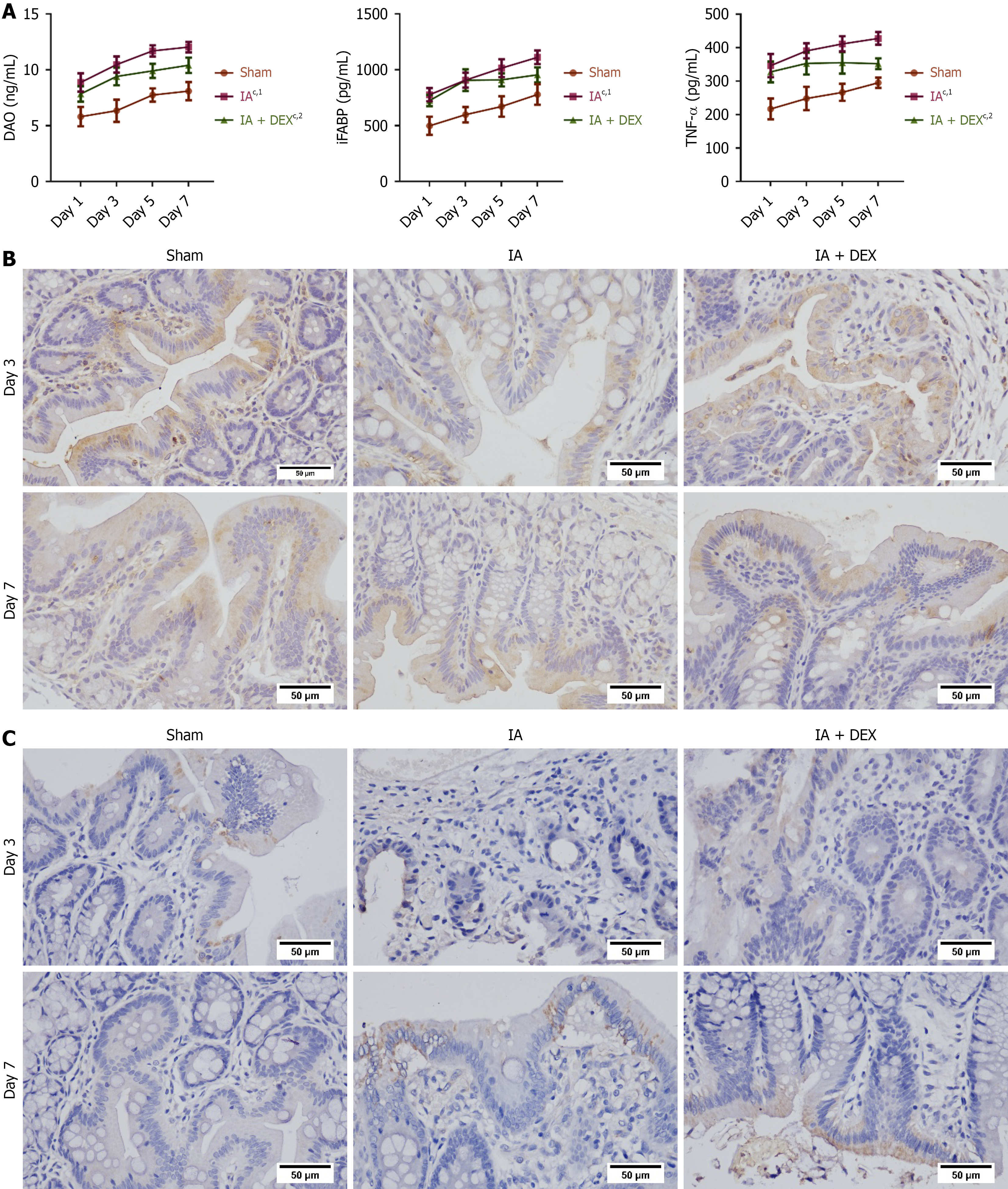 A: Serum levels of barrier markers (diamine oxidase; intestinal fatty acid-binding protein) and tumor necrosis factor-alpha measured by enzyme-linked immunosorbent assay at indicated time points after surgery (n = 6 per group); B: Immunohistochemical analysis of claudin-1 expression in intestinal tissues on postoperative days 3 and 7 (n = 6 per group); C: Immunohistochemical analysis of zonula occludens-1 expression in intestinal tissues on postoperative days 3 and 7 (n = 6 per group). Original magnification: 400 ×; scale bar: 50 μm. cP < 0.001. 1P compared with the sham group. 2P compared with the intestinal anastomosis group. DAO: Diamine oxidase; iFABP: Intestinal fatty acid-binding protein; TNF-α: Tumor necrosis factor-alpha; DEX: Dexmedetomidine; IA: Intestinal anastomosis; Sham group: Underwent abdominal only opening and closure; IA + DEX group: Dexmedetomidine was infused in the intestinal anastomosis model.