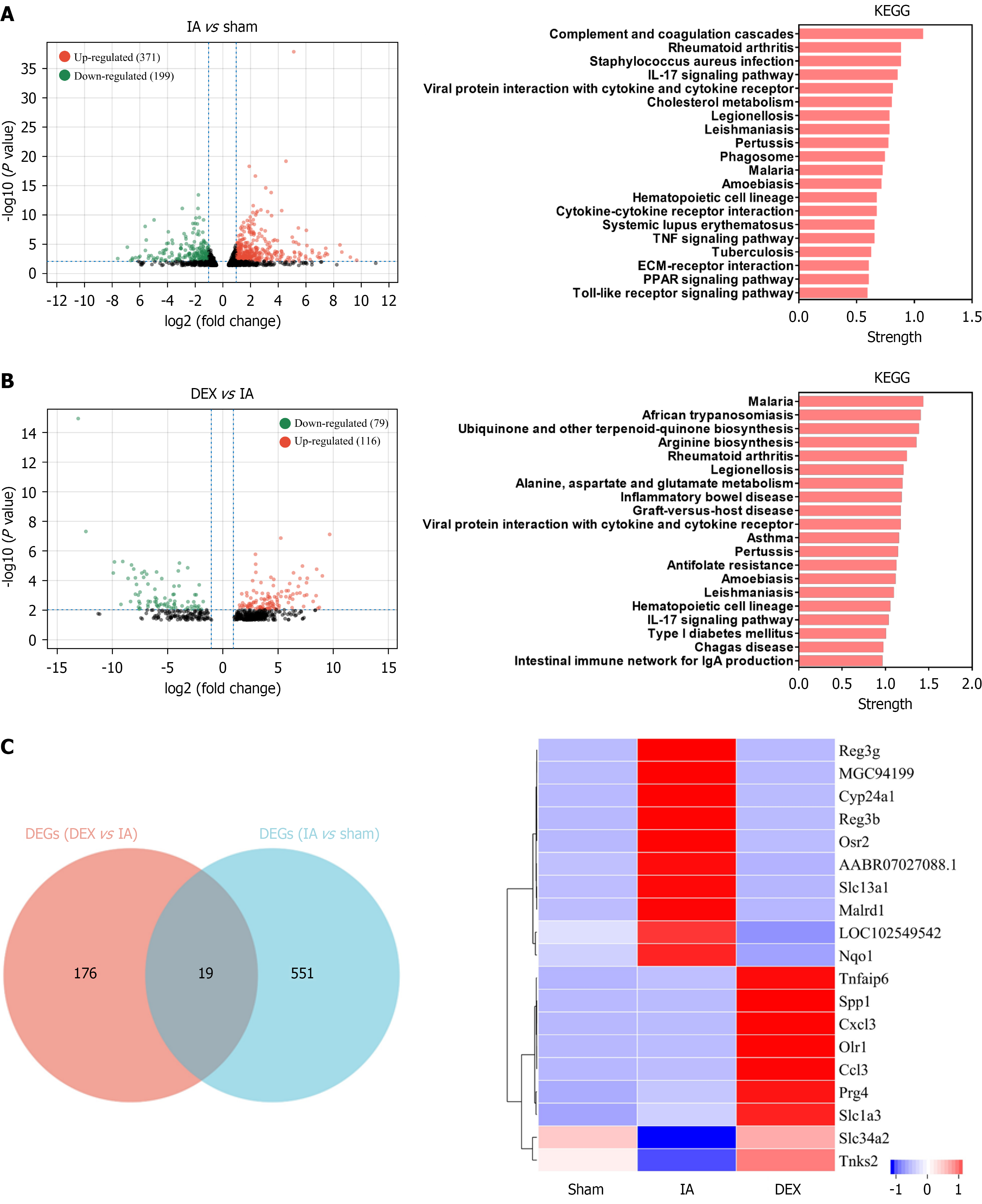 A: A comparative analysis between the intestinal anastomosis (IA) and the sham groups (screening criteria: Fold change > 2 and P < 0.01) identified 570 differentially expressed genes (DEGs), with 371 upregulated and 199 downregulated genes. Kyoto Encyclopedia of Genes and Genomes (KEGG) enrichment analysis of these 570 DEGs is shown in the right panel; B: Comparative analysis between the IA + dexmedetomidine (DEX) group and the IA group (screening criteria: Fold change > 2 and P < 0.01) identified 195 DEGs, including 116 upregulated and 79 downregulated DEGs. KEGG enrichment analysis of these 195 DEGs is presented in the right panel; C: The intersection of the two sets of DEGs revealed 19 overlapping genes. These genes, which both mediate IA progression and are modulated by DEX and represent potential therapeutic targets. A heatmap also illustrated the expression levels of these 19 genes across the three experimental groups. KEGG: Kyoto Encyclopedia of Genes and Genomes; TNF: Tumor necrosis factor; IL: Interleukin; ECM: Extracellular matrix; PPAR: Peroxisome proliferators-activated receptor; DEX: Dexmedetomidine; IA: Intestinal anastomosis; Sham group: Underwent abdominal only opening and closure.