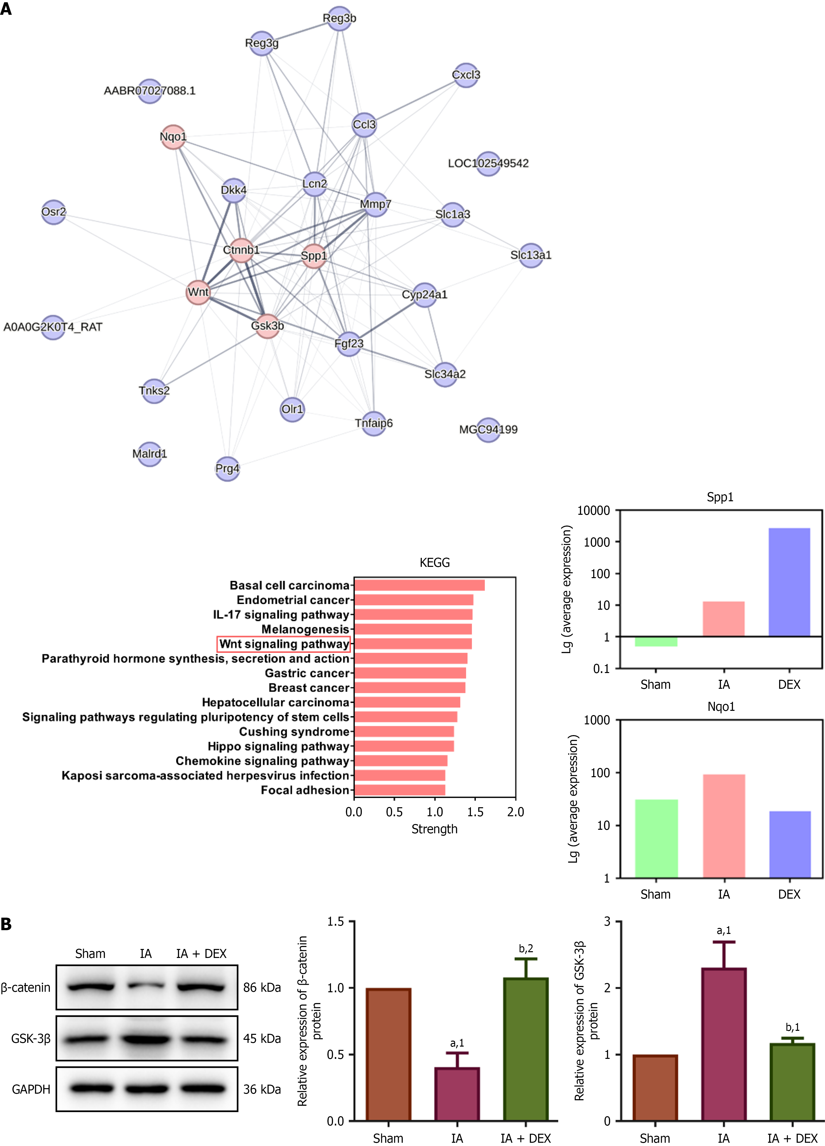 A: Protein-protein interaction network and Kyoto Encyclopedia of Genes and Genomes enrichment analysis of 19 key genes, identifying significant involvement of the Wnt signaling pathway; B: Dexmedetomidine upregulated the Wnt signaling pathway after intestinal anastomosis surgery (n = 3 per group). aP < 0.05. bP < 0.01. 1P compared with the sham group. 2P compared with the intestinal anastomosis group. KEGG: Kyoto Encyclopedia of Genes and Genomes; IL: Interleukin; GSK-3β: Glycogen synthase kinase-3 beta; GAPDH: Glyceraldehyde-3-phosphate dehydrogenase; DEX: Dexmedetomidine; IA: Intestinal anastomosis; Sham group: Underwent abdominal only opening and closure; IA + DEX group: Dexmedetomidine was infused in the intestinal anastomosis model.