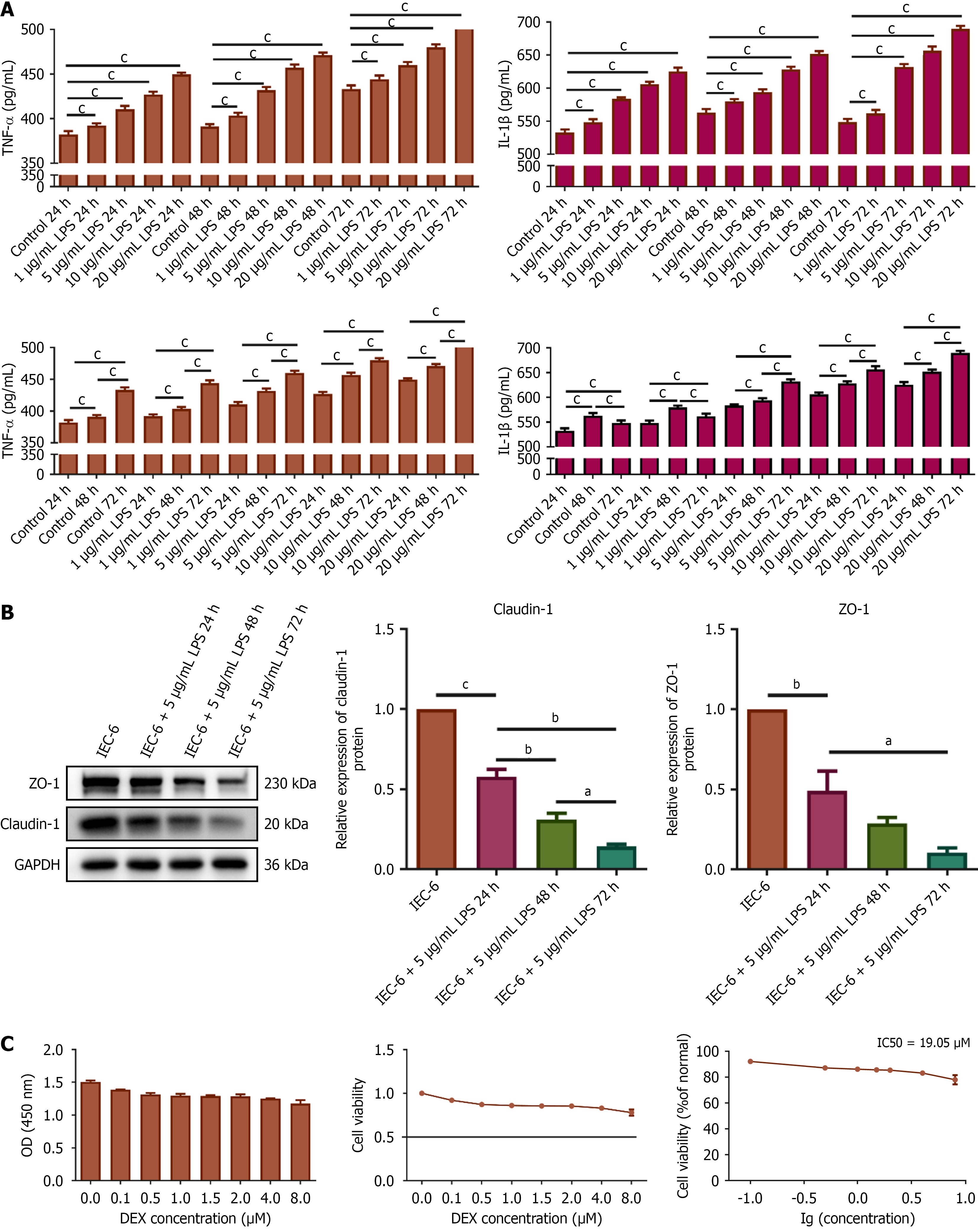 A: Tumor necrosis factor-alpha and interleukin-1β levels in supernatants of IEC-6 cells treated with various concentrations and durations of lipopolysaccharide (LPS), measured by enzyme-linked immunosorbent assay; B: The protein expression of claudin-1 and zonula occludens-1 in IEC-6 cells treated with 5 μg/mL LPS for the indicated durations, assessed by Western blotting; C: IEC-6 cell viability assessed by cell counting kit-8 assay following treatment with different concentrations of dexmedetomidine. aP < 0.05. bP < 0.01. cP < 0.001. Dexmedetomidine concentrations selected for subsequent experiments: Dexmedetomidine-low (2.4 μM), Dexmedetomidine-high (4.8 μM). TNF: Tumor necrosis factor; IL: Interleukin; GAPDH: Glyceraldehyde-3-phosphate dehydrogenase; LPS: Lipopolysaccharide; ZO-1: Zonula occludens-1; OD: Optical density; DEX: Dexmedetomidine.
