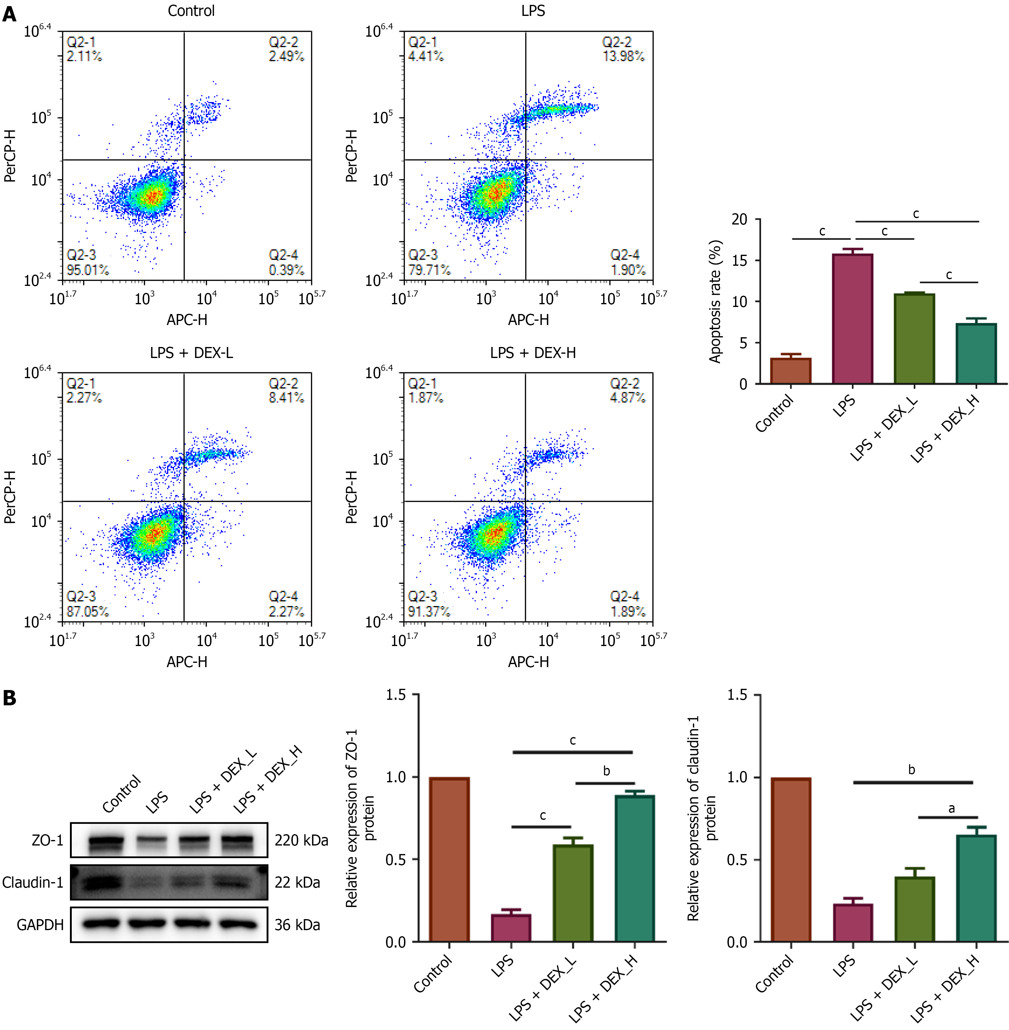 A: Attenuated lipopolysaccharide-induced apoptosis; B: Upregulated the expression of tight junction proteins. aP < 0.01. bP < 0.001. cP < 0.0001. Dexmedetomidine (DEX)-low = 2.4 μM DEX; DEX-high = 4.8 μM DEX. Control group: IEC-6 cells maintained in standard culture medium; LPS group: IEC-6 cells treated with 5 μg/mL lipopolysaccharide for 72 hours; LPS + DEX-L group: IEC-6 cells pretreated with 2.4 μM dexmedetomidine for 24 hours followed by treatment with 5 μg/mL lipopolysaccharide for 72 hours; LPS + DEX-H group: IEC-6 cells pretreated with 4.8 μM dexmedetomidine for 24 hours followed by 5 μg/mL lipopolysaccharide for 72 hours; LPS: Lipopolysaccharide; DEX: Dexmedetomidine; L: Low; H: High; APC-H: Allophycocyanin-height; PerCP-H: Peridinin-chlorophyll-protein complex-height; GAPDH: Glyceraldehyde-3-phosphate dehydrogenase; ZO-1: Zonula occludens-1.
