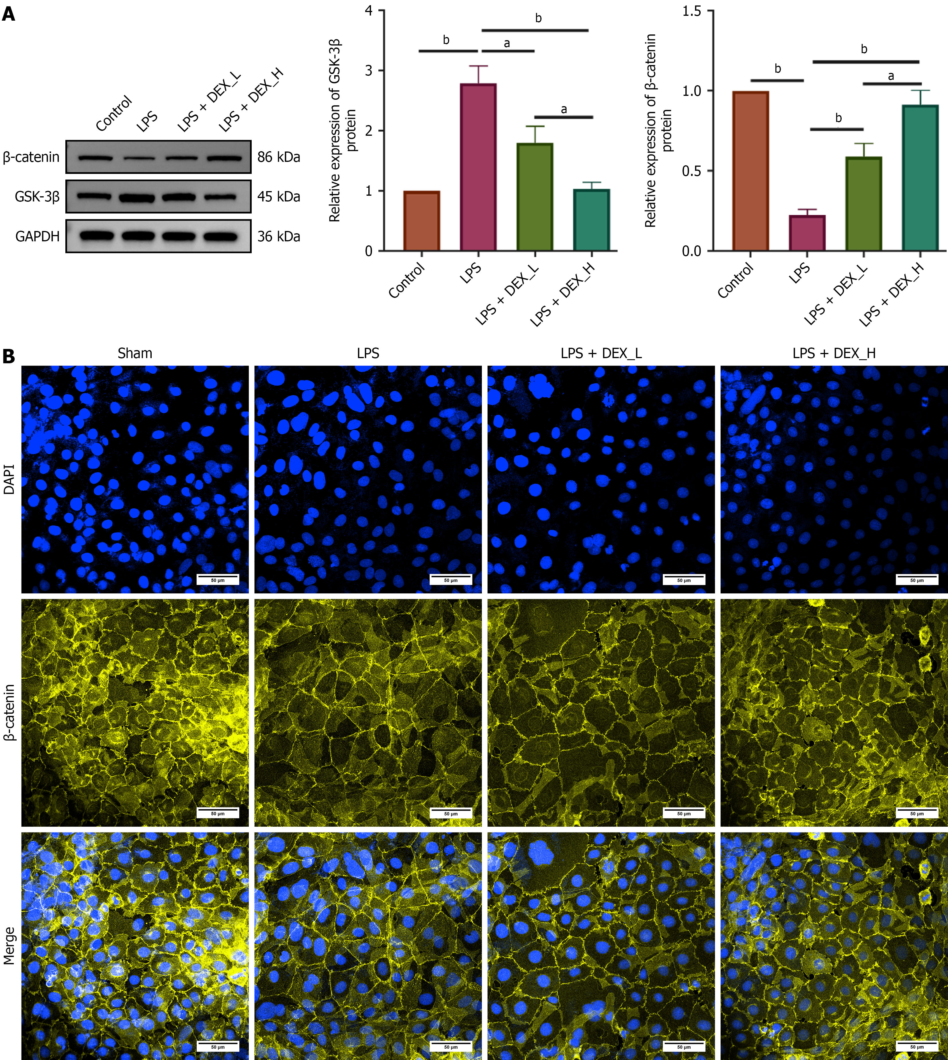 A: Western blotting for the protein expression of β-catenin and glycogen synthase kinase-3 beta in IEC-6 cells treated with lipopolysaccharide and dexmedetomidine. Glyceraldehyde-3-phosphate dehydrogenase was used as the loading control; B: Immunofluorescence staining of β-catenin in IEC-6 cells (original magnification: 600 ×; scale bar: 50 μm). Data are presented as mean ± SD. aP < 0.01. bP < 0.001. 4’,6-diamidino-2-phenylindole (DAPI) (blue) was used to stain cell nuclei, while β-catenin (yellow) was used to visualize its subcellular localization. Merged images combine DAPI and β-catenin staining. Dexmedetomidine (DEX)-low = 2.4 μM DEX; DEX-high = 4.8 μM DEX. Control group: IEC-6 cells maintained in standard culture medium; LPS group: IEC-6 cells treated with 5 μg/mL lipopolysaccharide for 72 hours; LPS + DEX-L group: IEC-6 cells pretreated with 2.4 μM dexmedetomidine for 24 hours followed by treatment with 5 μg/mL lipopolysaccharide for 72 hours; LPS + DEX-H group: IEC-6 cells pretreated with 4.8 μM dexmedetomidine for 24 hours followed by 5 μg/mL lipopolysaccharide for 72 hours; LPS: Lipopolysaccharide; DEX: Dexmedetomidine; L: Low; H: High; GAPDH: Glyceraldehyde-3-phosphate dehydrogenase; GSK-3β: Glycogen synthase kinase-3 beta.