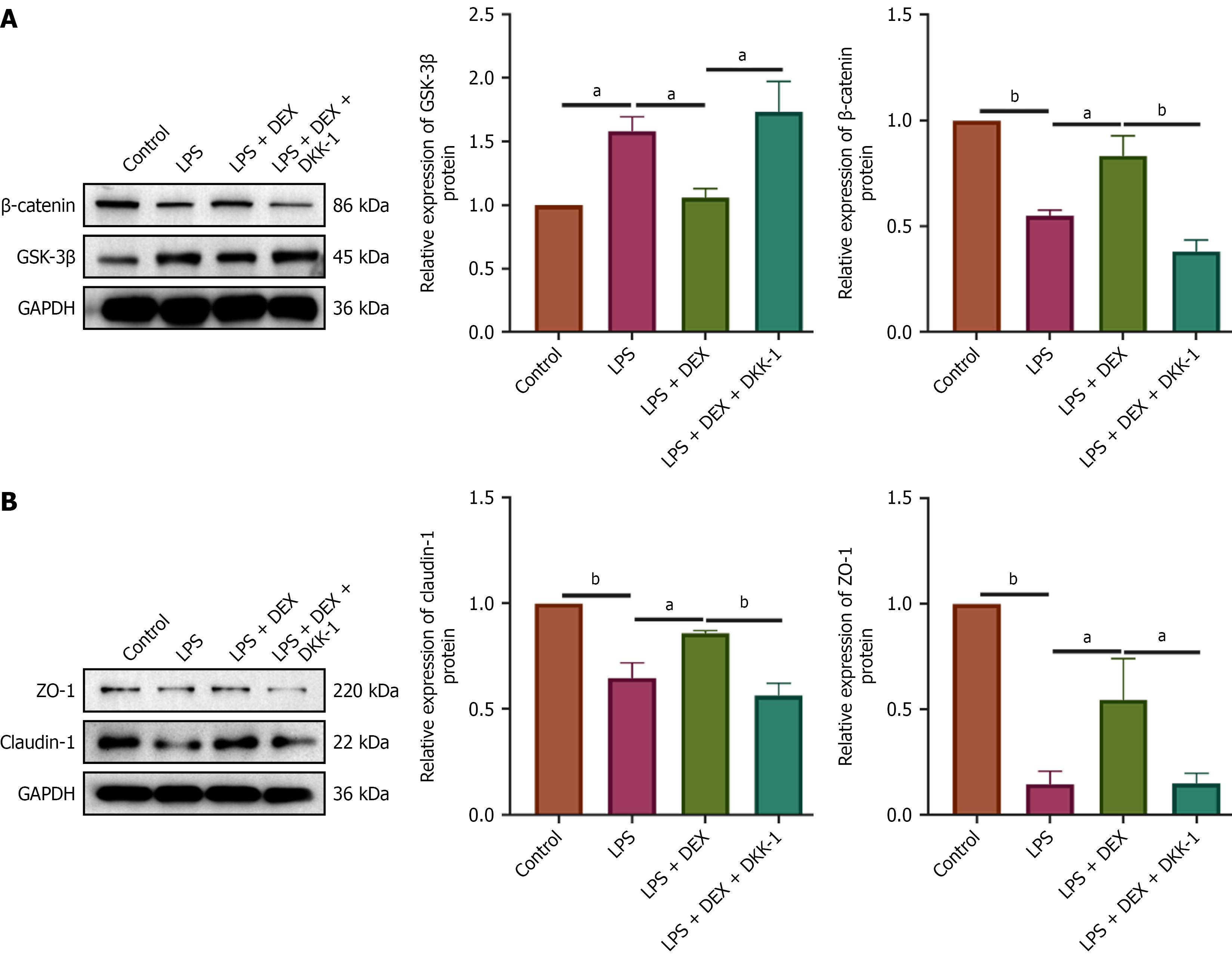 A: Western blot detection of β-catenin expression levels in each group of cells; B: Western blot detection of zonula occludens-1 (ZO-1) expression levels in each group of cells. Western blot results indicate that dickkopf-1 (DKK-1) effectively inhibits the Wnt signaling pathway, and that inhibiting Wnt signaling reverses dexmedetomidine’s upregulatory effect on claudin-1 and ZO-1 expression levels. aP < 0.01. bP < 0.001. Control group: IEC-6 cells maintained in standard culture medium; LPS group: IEC-6 cells treated with 5 μg/mL lipopolysaccharide for 72 hours; LPS + DEX group: IEC-6 cells pretreated with 4.8 μM dexmedetomidine for 24 hours followed by treatment with 5 μg/mL lipopolysaccharide for 72 hours; LPS + DEX + DKK-1 group: IEC-6 cells pretreated with 4.8 μM dexmedetomidine and 100 ng dickkopf-1 for 24 hours followed by 5 μg/mL lipopolysaccharide for 72 hours; LPS: Lipopolysaccharide; DEX: Dexmedetomidine; GAPDH: Glyceraldehyde-3-phosphate dehydrogenase; GSK-3β: Glycogen synthase kinase-3 beta; DKK-1: Dickkopf-1; ZO-1: Zonula occludens-1.