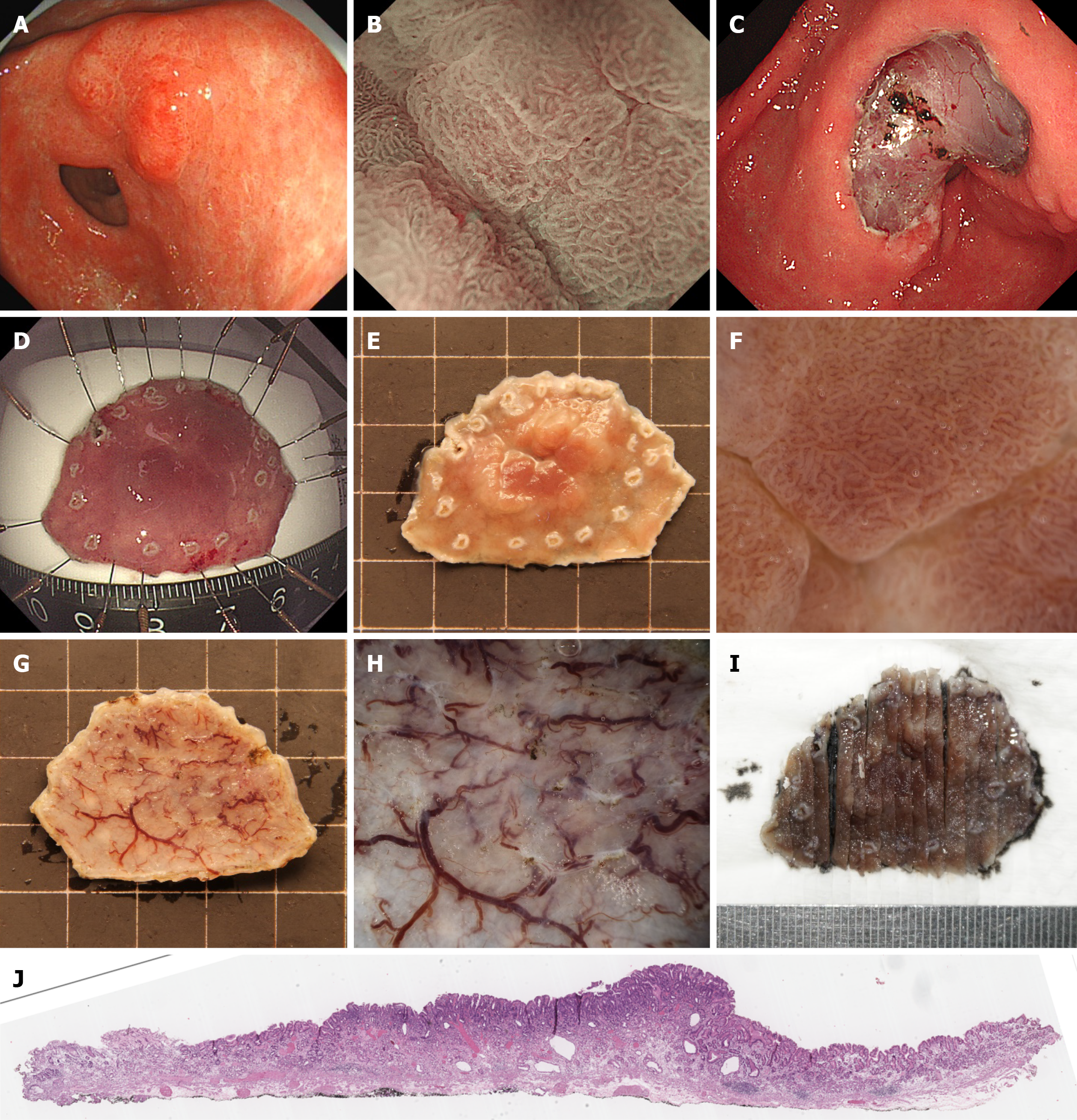 A: White light imaging of a 0-IIa + IIc lesion in the gastric antrum; B: Magnifying endoscopy with narrow-band imaging of the lesion, demonstrating irregular microsurface and microvascular patterns; C: Post-endoscopic submucosal dissection mucosal defect with visible submucosal vasculature; D: The endoscopic submucosal dissection specimen was spread and pinned on a fixation board for formalin fixation; E: Stereomicroscopic evaluation of the specimen after 24-hour formalin fixation; F: High-magnification stereomicroscopy of the lesion surface, correlating with magnifying endoscopy with narrow-band imaging findings in B, showing irregular microsurface and microvascular architecture; G: Basal surface of the resected specimen under stereomicroscopy; H: High-magnification stereomicroscopy of the basal surface, revealing intact and homogeneous submucosal connective tissue architecture; I: Systematic vertical sectioning of the specimen at 2- to 3-mm intervals, ensuring accurate histopathologic evaluation of margins; J: Histopathological images confirming mucosal (M) diagnosis and margin status.