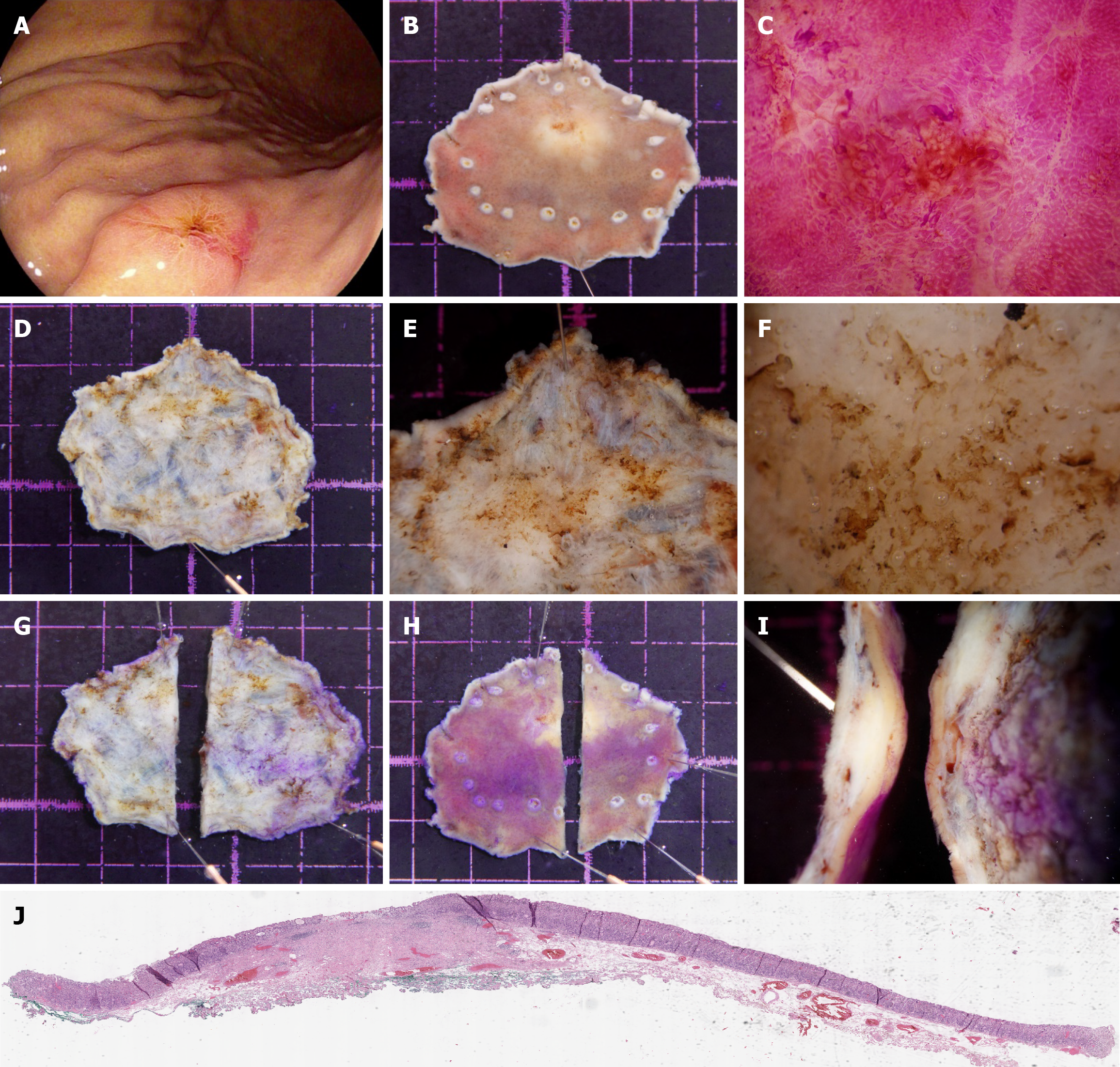 A: White light imaging of a 0-IIa + IIc lesion located on the posterior wall of the proximal gastric body, exhibiting a central depression; B: Stereomicroscopic evaluation of the specimen after 24-hour formalin fixation; C: High-magnification stereomicroscopy of the central depressed area after eosin staining, demonstrating irregular microsurface patterns; D: Stereomicroscopic overview of the basal surface of the specimen; E: Medium-magnification stereomicroscopy of the basal surface, revealing a thickened submucosal layer with a yellowish-white discoloration; F: High-magnification stereomicroscopy of the basal surface, showing loss of submucosal connective tissue architecture, indicative of tumor invasion into the submucosa; G: The initial incision of the specimen was performed at a distance from the suspected submucosal invasion site on the basal surface to avoid disrupting the area of interest; H: The specimen was inverted to expose the mucosal surface, followed by systematic sampling at 2-mm to 3-mm intervals; I: Lateral view highlighting the deepest point of submucosal invasion; J: Histopathological images confirming the submucosal diagnosis and margin status.