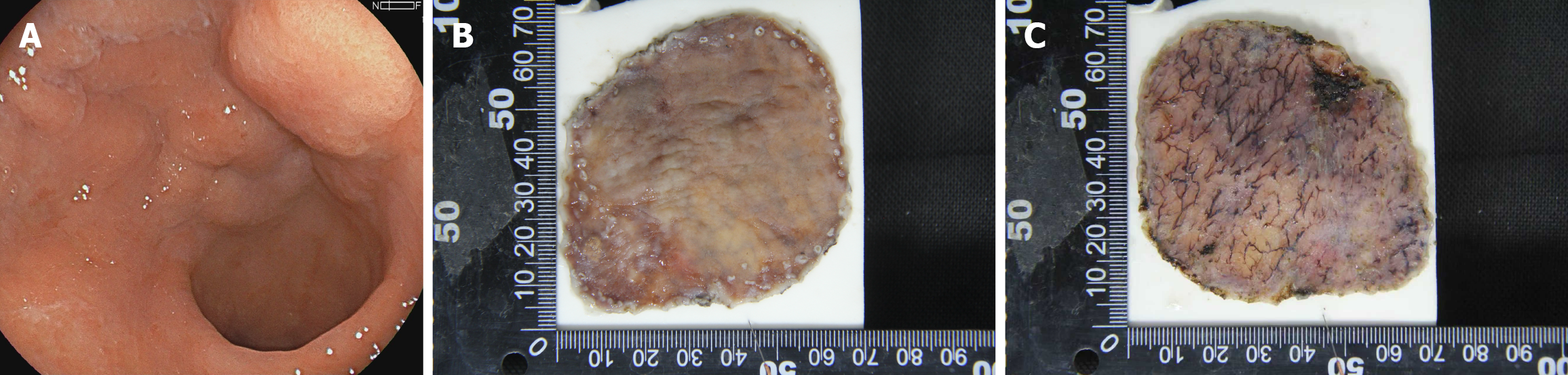 A: White light imaging of the lesion; B: Stereomicroscopic overview of the formalin-fixed specimen (mucosal surface); C: Stereomicroscopic view of the specimen’s vertical (basal) margin, the submucosa presents with uniformly thick, transparent connective tissue without significant whitish discoloration (individual foci diameter < 5 mm), leading to an erroneous diagnosis of a mucosal lesion (stereomicroscopy-mucosa). Final histopathology confirmed submucosal invasion to a depth of 100 μm (pT1b).