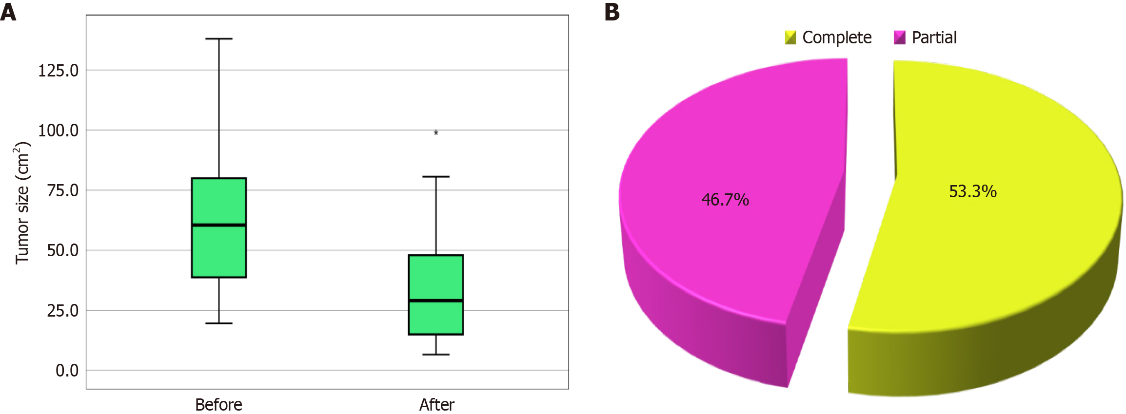 A: Tumor size before and after treatment in the hepatocellular carcinoma (HCC) group; B: Treatment response in the HCC group.