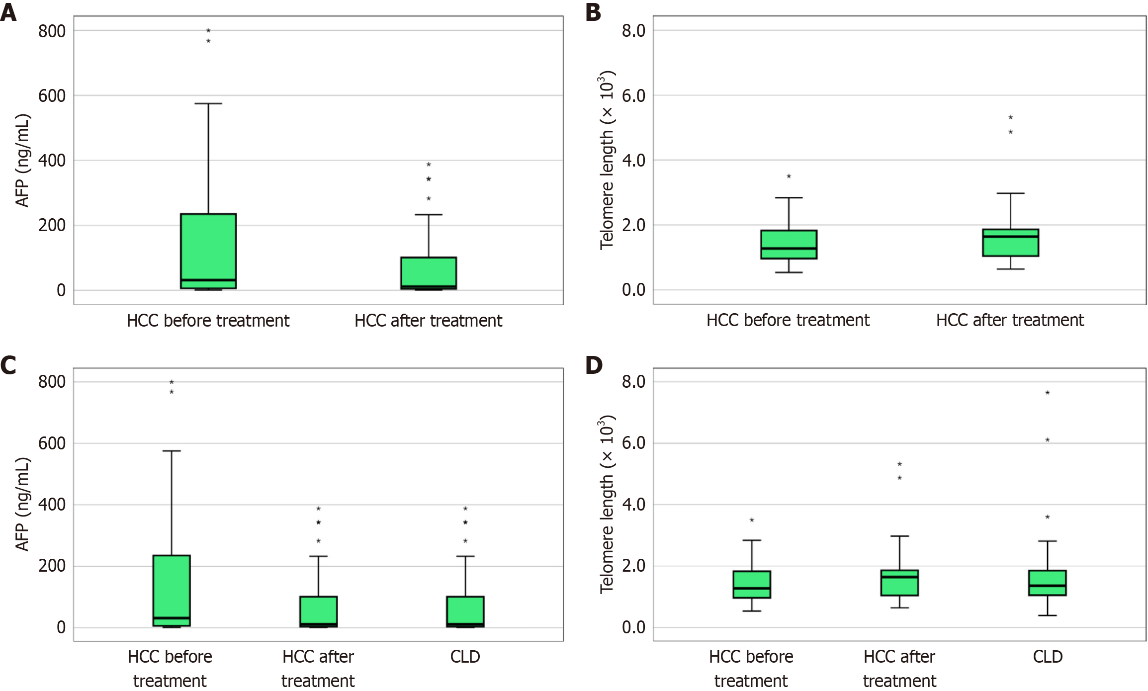 A: Alpha fetoprotein (AFP) before and after treatment in the hepatocellular carcinoma (HCC) group; B: Telomere length before and after treatment in the HCC group; C: AFP before and after treatment in the HCC and chronic liver disease (CLD) groups; D: Telomere length before and after treatment in the HCC and CLD groups. AFP: Alpha fetoprotein; HCC: Hepatocellular carcinoma; CLD: Chronic liver disease. Asterisks represent the dataset outliers.