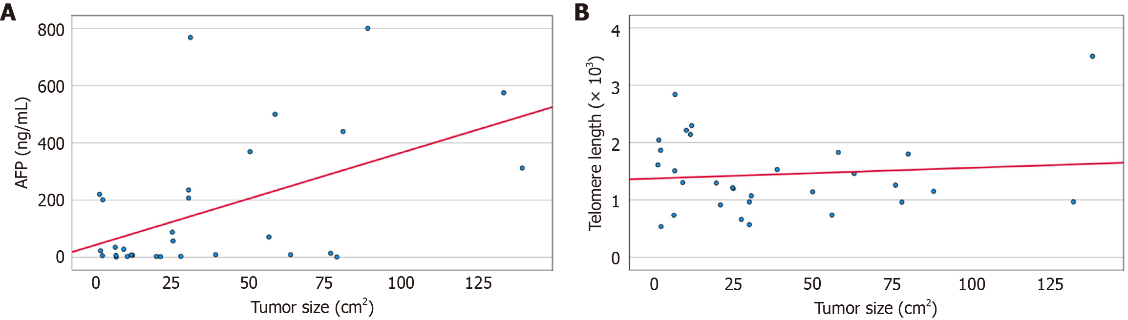 A: Correlation between alpha fetoprotein before treatment and tumor size in the hepatocellular carcinoma (HCC) group; B: Correlation between telomere length after treatment and tumor size in the HCC group. AFP: Alpha fetoprotein.