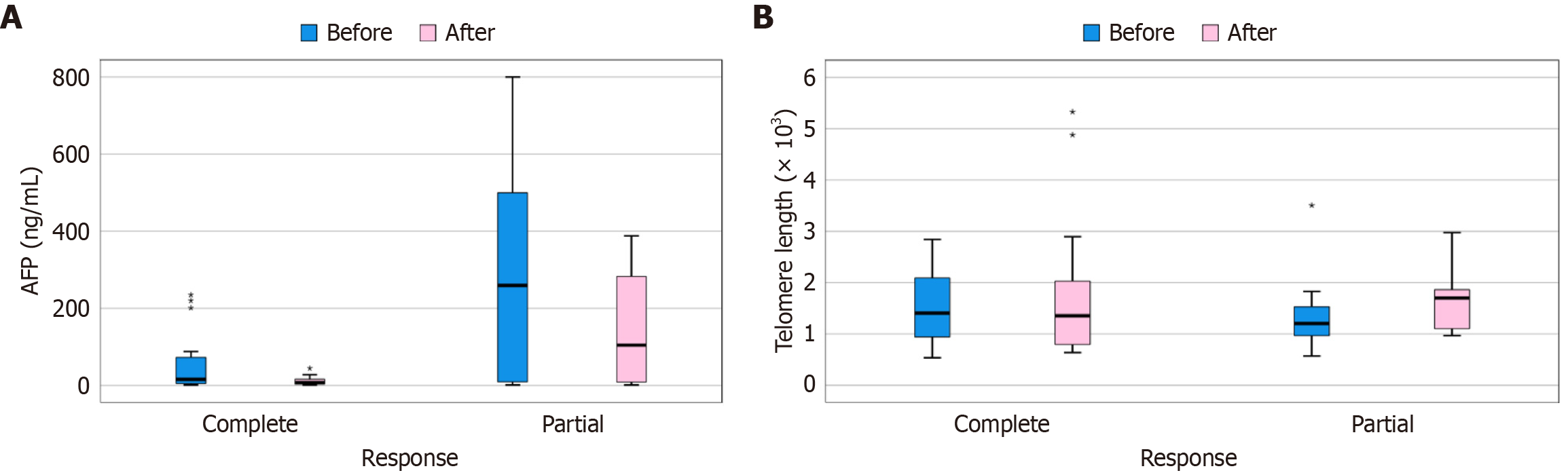 A: Comparison of alpha fetoprotein before and after treatment according to response in the hepatocellular carcinoma (HCC) group; B: Comparison of telomere length before and after treatment according to response in the HCC group. AFP: Alpha fetoprotein. Asterisks represent the dataset outliers.