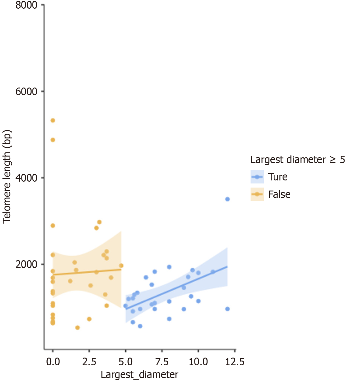 Scatter plot showing the relationship between telomere length and largest diameter of hepatic focal lesions for all data samples in the hepatocellular carcinoma group before or after treatment.