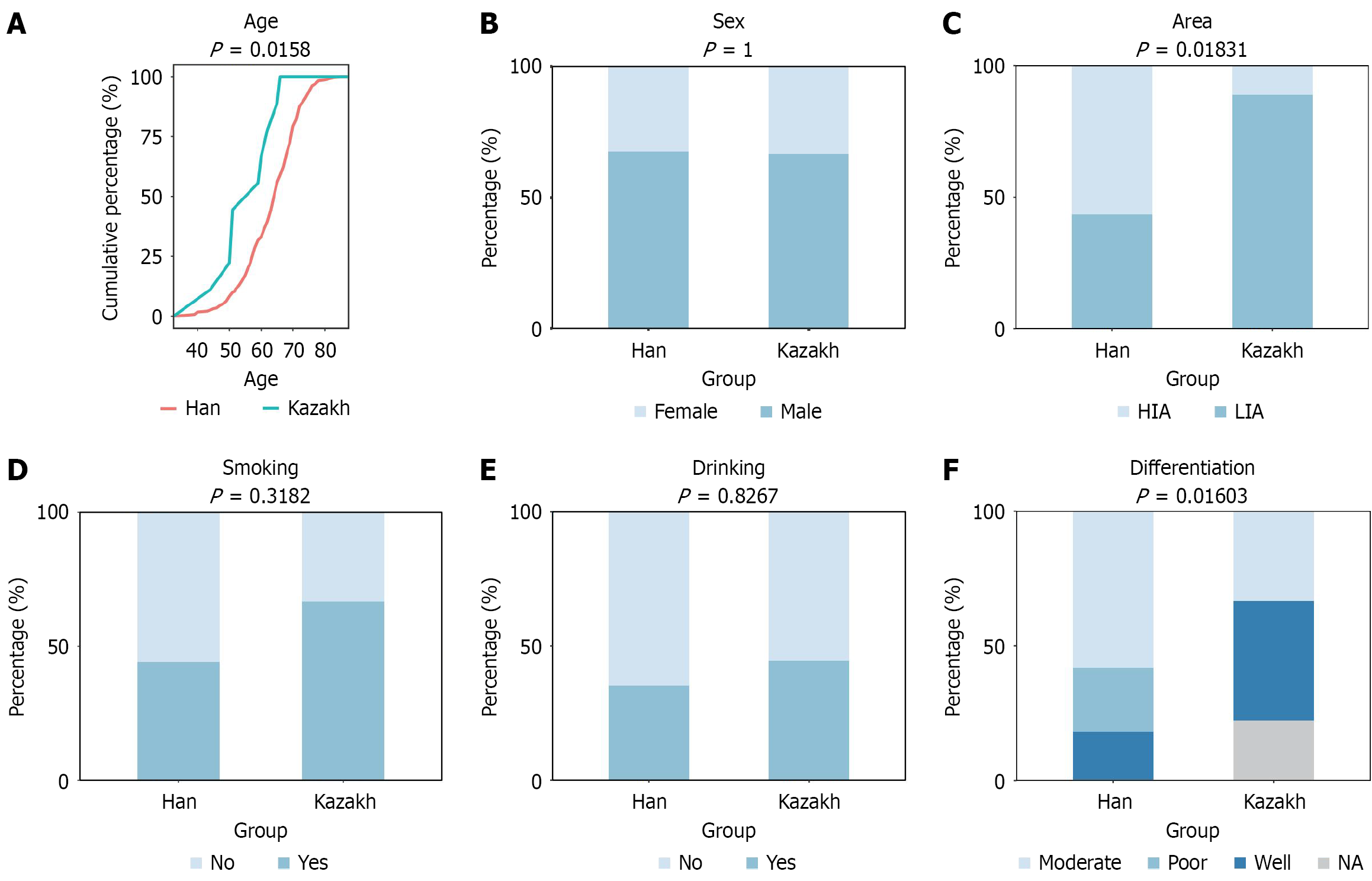 A: Diagnosis; B: Sex; C: Area; D: Smoking; E: Alcohol drinking; F: Differentiation. Analysis of variance test was used to calculate the P value for age at diagnosis, and χ2 test was used for the other factors. HIA: High incidence area; LIA: Low incidence area.