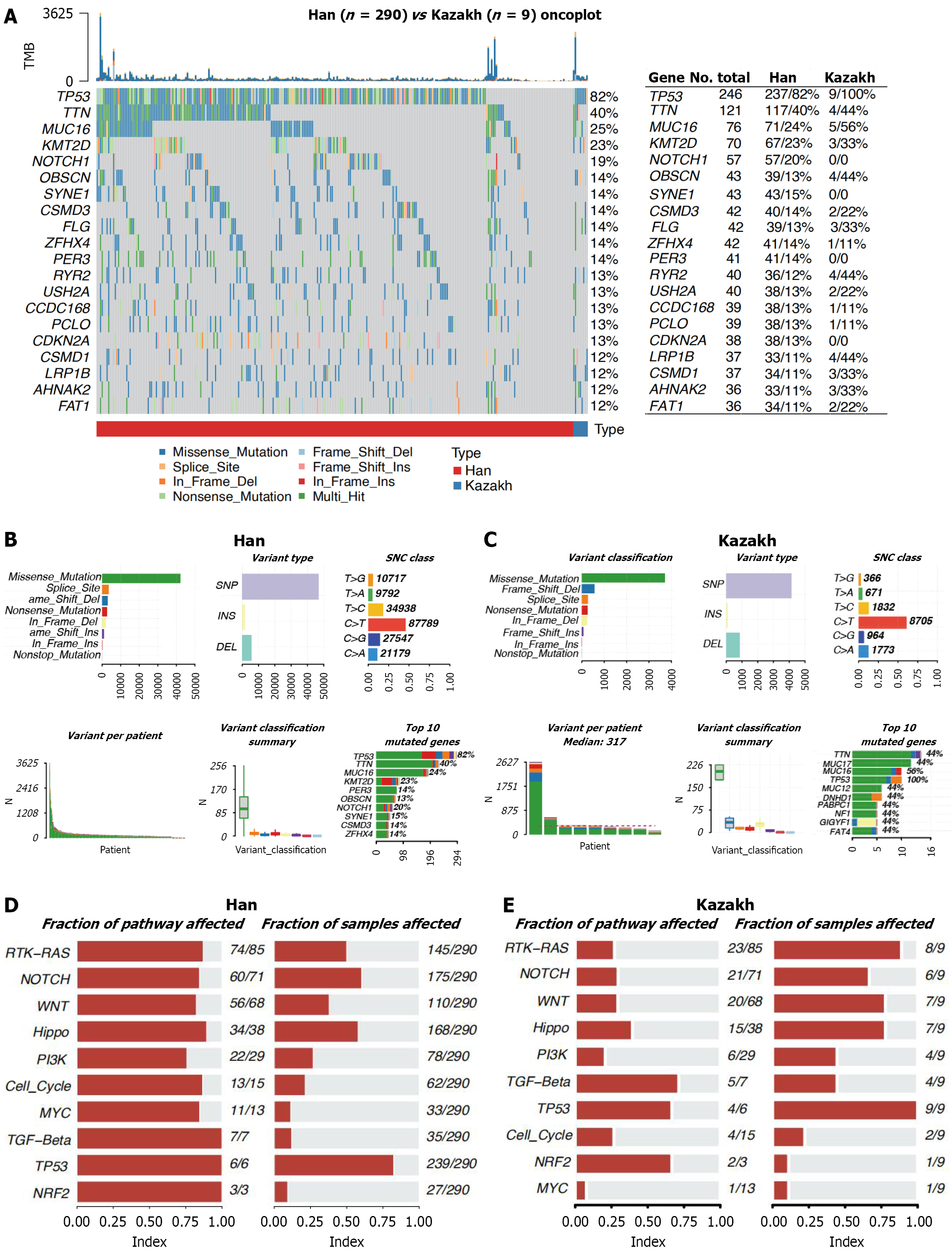 A: Significantly mutated genes (SMGs) identified by MutSigCV on a combined cohort of Han and Kazakh ethnics groups, Chinese whole-exome sequence samples. Each column denotes an esophageal squamous cell carcinoma patient, and each row is a gene. On top is the number of somatic mutations per sample. On the right are the mutation frequencies of each SMG. The bar plot on the top shows the composition of mutations in the gene. Genes are ordered by their mutation frequencies. The table on the right shows the number of mutation population of total, Han and Kazakh; B and C: Visualizing mutation summary. This maftools plot shows a summary of the multiple alignment format file. Highlighting the most mutated genes, single-nucleotide variant class, and variant classification distributions within a tumor type for Han and Kazakh patients; D and E: Fraction of pathway and sample affected for Han and Kazakh. SNV: Single nucleotide variant; SNP: Single nucleotide polymorphism; INS: Insertion; DEL: Deletion; PI3K: Phosphatidylinositol 3-kinase; TGF: Transforming growth factor; NRF2: Nuclear factor erythroid 2-related factor 2.
