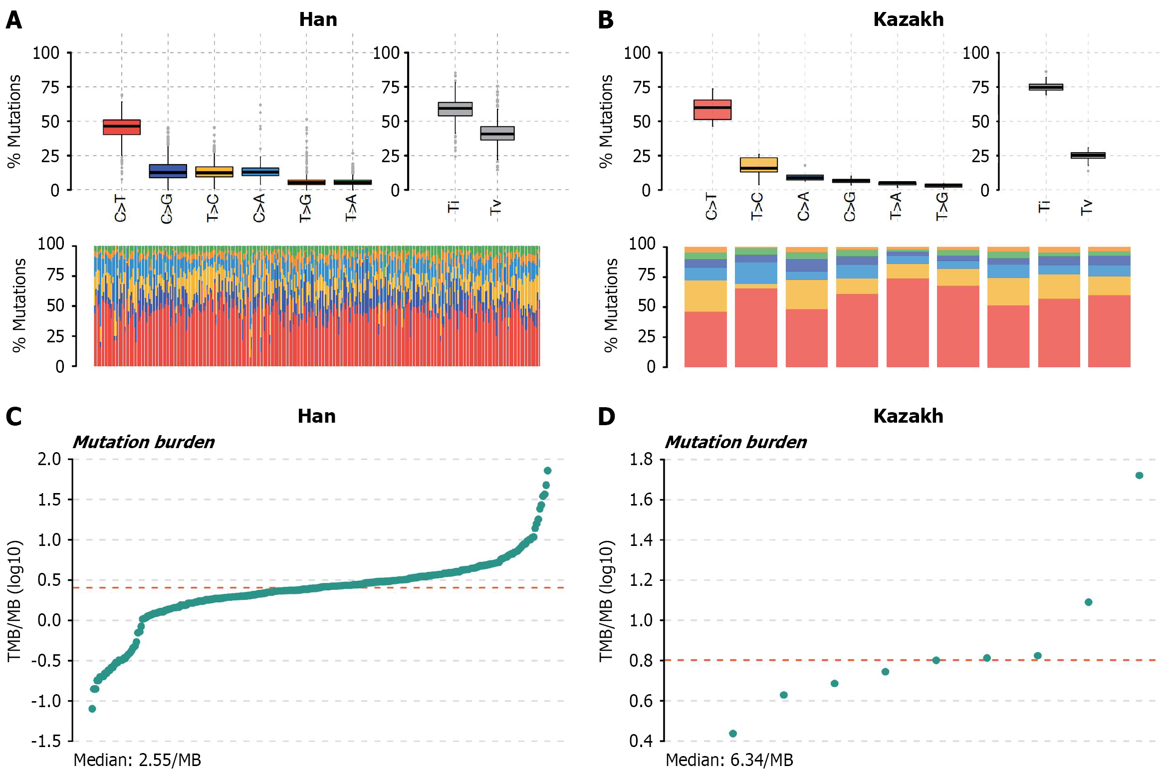 A and B: The transition and transversion plot illustrates the distribution of single-nucleotide variants (above) in esophageal squamous cell carcinoma, categorized into six transition and transversion events. The core purpose is to describe the distribution characteristics (such as central tendency, dispersion degree, outliers, etc.) of a single set of data (for example, a certain transformation/transposition event). The stacked bar chart (bottom) displays the mutational spectrum distribution of each sample in the multiple alignment format file. Present the “proportion distribution of categorical data” in a visual way to assist in understanding the heterogeneity of the mutation spectrum among different samples; C and D: Mutation burden. The core is to describe the distribution characteristics of tumor mutational burden among the samples, including the central tendency (such as the median) and the degree of dispersion (such as the range of variation). TMB: Tumor mutation burden; MB: Mega base.