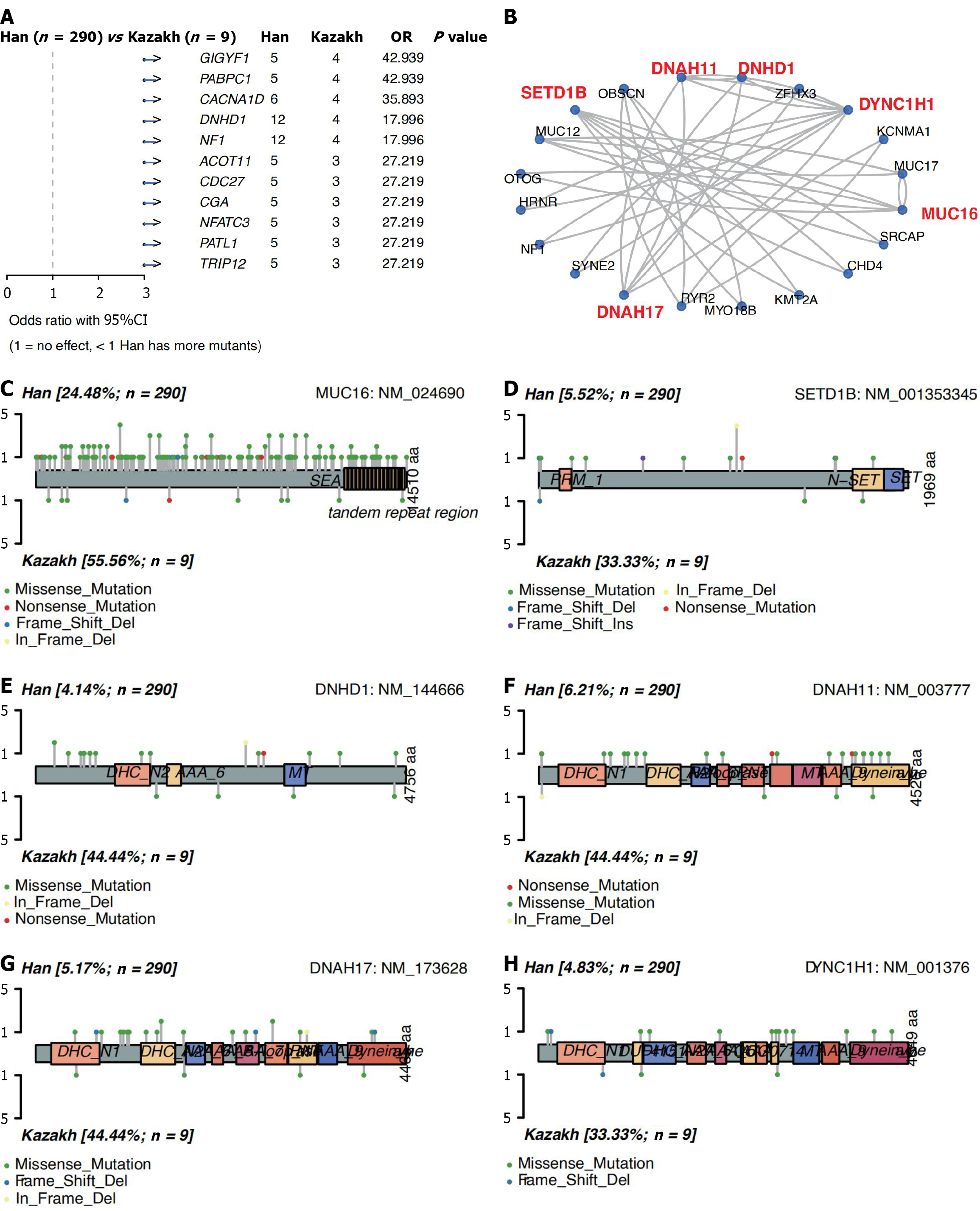 A: Difference gene between the two ethnics groups (P < 0.001); B: Gene-gene interaction network between difference and significant mutation genes (P < 0.05, and the mutation frequency ≥ 5%); C-H: Schematics of protein changes in ethnics-biased gene products. Scattered distribution of somatic mutations in MUC16, SETD1B, DNHD1, DNAH11, DNAH17, DYNC1H1. OR: Odds ratio; CI: Confidence interval.