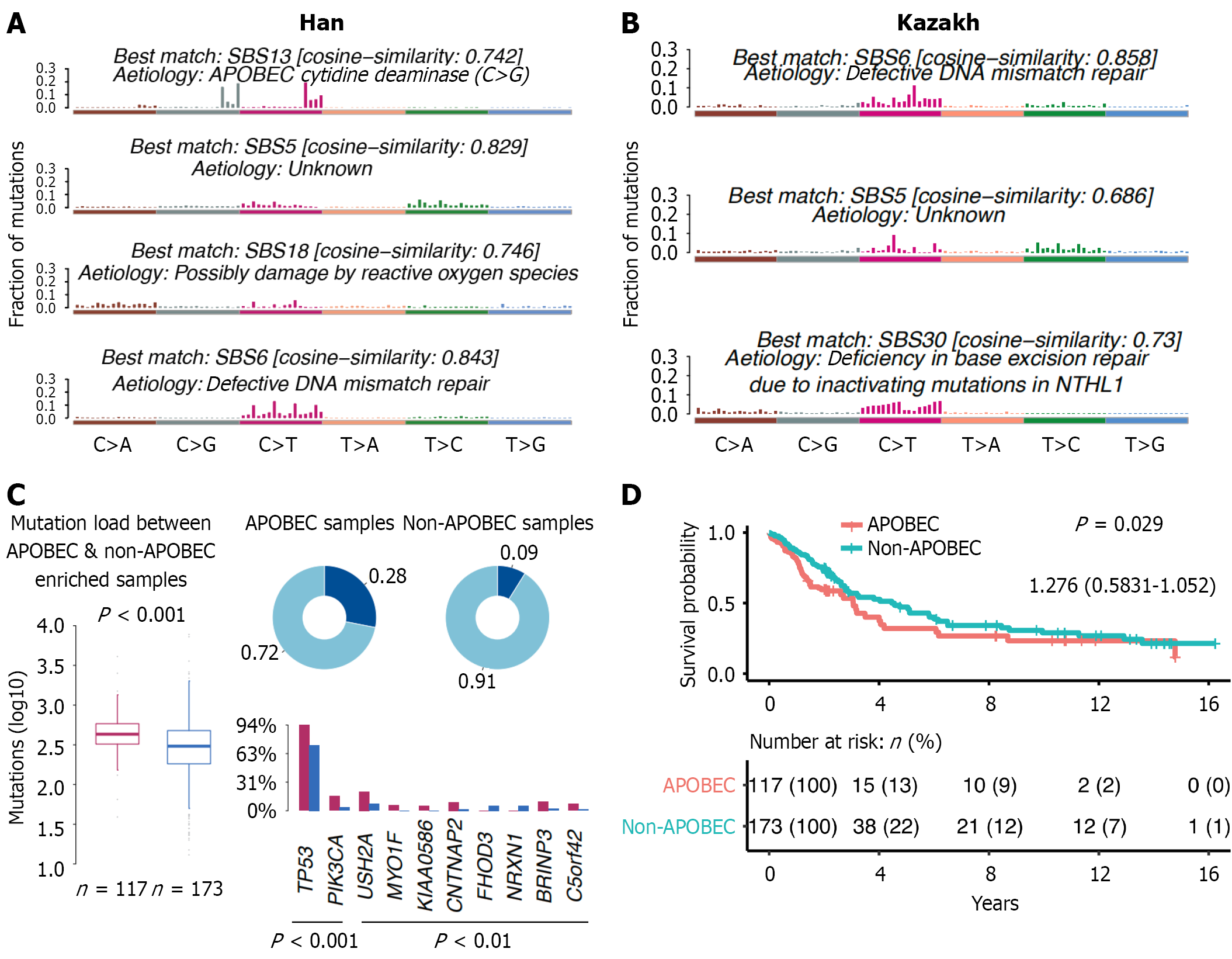 A: Han; B: Kazakh patients. Each row presents a specific single base substitutions (SBS) signature (Catalogue of Somatic Mutations in Cancer reference signatures with known etiologies) and its best match with known signatures. The distribution of each signature shows the relative frequencies of the six single-base substitution types. Different SBS signatures are associated with different pathogenic mechanisms, such as apolipoprotein B messenger RNA-editing enzyme catalytic polypeptide (APOBEC) cytidine deaminase, unknown mechanisms, possible reactive oxygen species damage, and DNA mismatch repair deficiency, etc.; C: Differences between APOBEC enriched and non-enriched patients for Han patients (none of the samples are enriched for APOBEC in Kazakh patients); D: Survival plot of Han patients. SBS: Single base substitution; APOBEC: Apolipoprotein B messenger RNA-editing enzyme catalytic polypeptide.