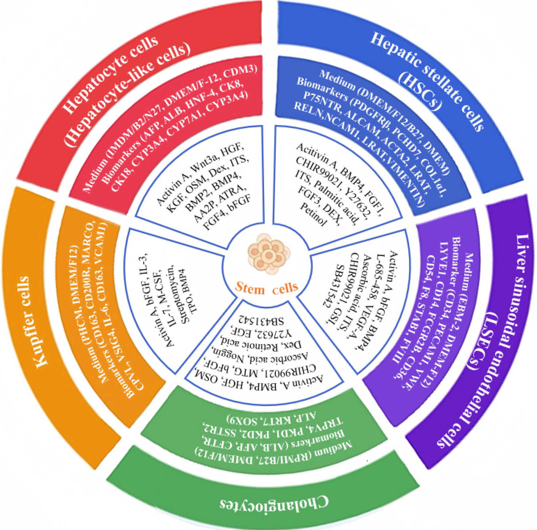 The image shows the constituents for major liver lineage generation from stem cells, including medium, the supplements and cytokine cocktails, and lineage-specific biomarkers. HSCs: Hepatic stellate cells; LSECs: Liver sinusoidal endothelial cells; DMEM: Dulbecco’s modified eagle medium; MARCO: Macrophage receptor with collagenous structure; VCAM1: Vascular cell adhesion molecule 1; bFGF: Basic fibroblast growth factor; TPO: Thrombopoietin; BMP4: Bone morphogenetic protein 4; ALB: Albumin; AFP: Alpha-fetoprotein; CFTR: Cystic fibrosis transmembrane conductance regulator; SSTR2: Somatostatin receptor 2; KRT7: Keratin 7; SOX9: SRY-box transcription factor 9; HGF: Hepatocyte growth factor; MTG: Methyl-β-cyclodextrin; EGF: Epidermal growth factor; LYVE1: Lymphatic vessel endothelial hyaluronan receptor 1; VEGF-A: Vascular endothelial growth factor A; ITS: Insulin-transferrin-selenium; PDGFRβ: Platelet-derived growth factor receptor β; FGF1: Fibroblast growth factor 1; DEX: Dexamethasone; KGF: Keratinocyte growth factor; ATRA: All-trans retinoic acid; FGF4: Fibroblast growth factor 4; IL: Interleukin; M-CSF: Macrophage colony-stimulating factor.