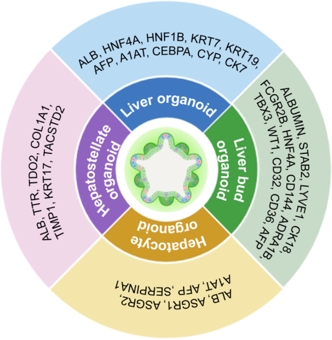 Illustration image shows the major subtypes of stem cell-based liver organoids and the corresponding biomarkers. ALB: Albumin; HNF4A: Hepatocyte nuclear factor 4 alpha; HNF1B: Hepatocyte nuclear factor 1 beta; KRT7: Keratin 7; KRT19: Keratin 19; AFP: Alpha-fetoprotein; A1AT: Alpha-1-antitrypsin; CEBPA: CCAAT/enhancer binding protein alpha; CYP: Cytochrome P450; CK7: Cytokeratin 7; STAB2: Stabilin 2; LYVE1: Lymphatic vessel endothelial hyaluronan receptor 1; CK18: Cytokeratin 18; FCGR2B: Fc gamma receptor IIb; ADRA1B: Alpha-1B adrenergic receptor; TBX3: T-box transcription factor 3; WT1: Wilms tumor 1; ASGR1: Asialoglycoprotein receptor 1; ASGR2: Asialoglycoprotein receptor 2; SERPINA1: Serpin family a member 1; TTR: Transthyretin; TDO2: Tryptophan 2,3-dioxygenase; COL1A1: Collagen type I alpha 1 chain; TIMP1: Tissue inhibitor of metalloproteinases 1; KRT17: Keratin 17; TACSTD2: Tumor-associated calcium signal transducer 2.