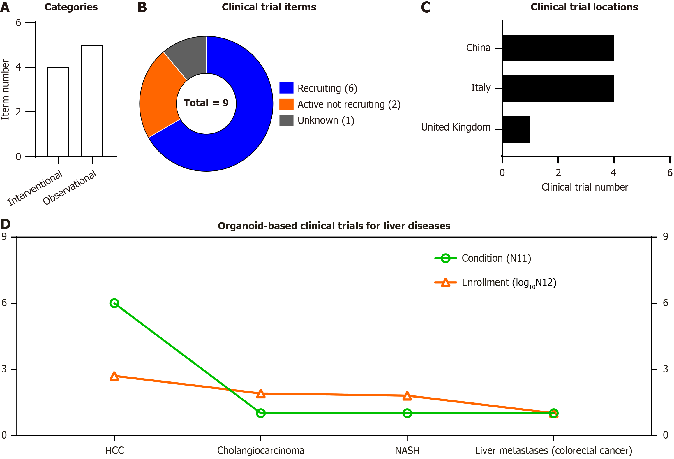 A: The categories of the registered liver organoid-based clinical trials according to ClinicalTrial.gov; B and C: The status and location of the abovementioned liver organoid-based clinical trials; D: The distribution of the organoid-based clinical trials for liver diseases according to clinical trial number [condition (N11)] and the corresponding enrolled participants [enrollment (Log10N12)]. HCC: Hepatocellular carcinoma; NASH: Non-alcoholic steatohepatitis.
