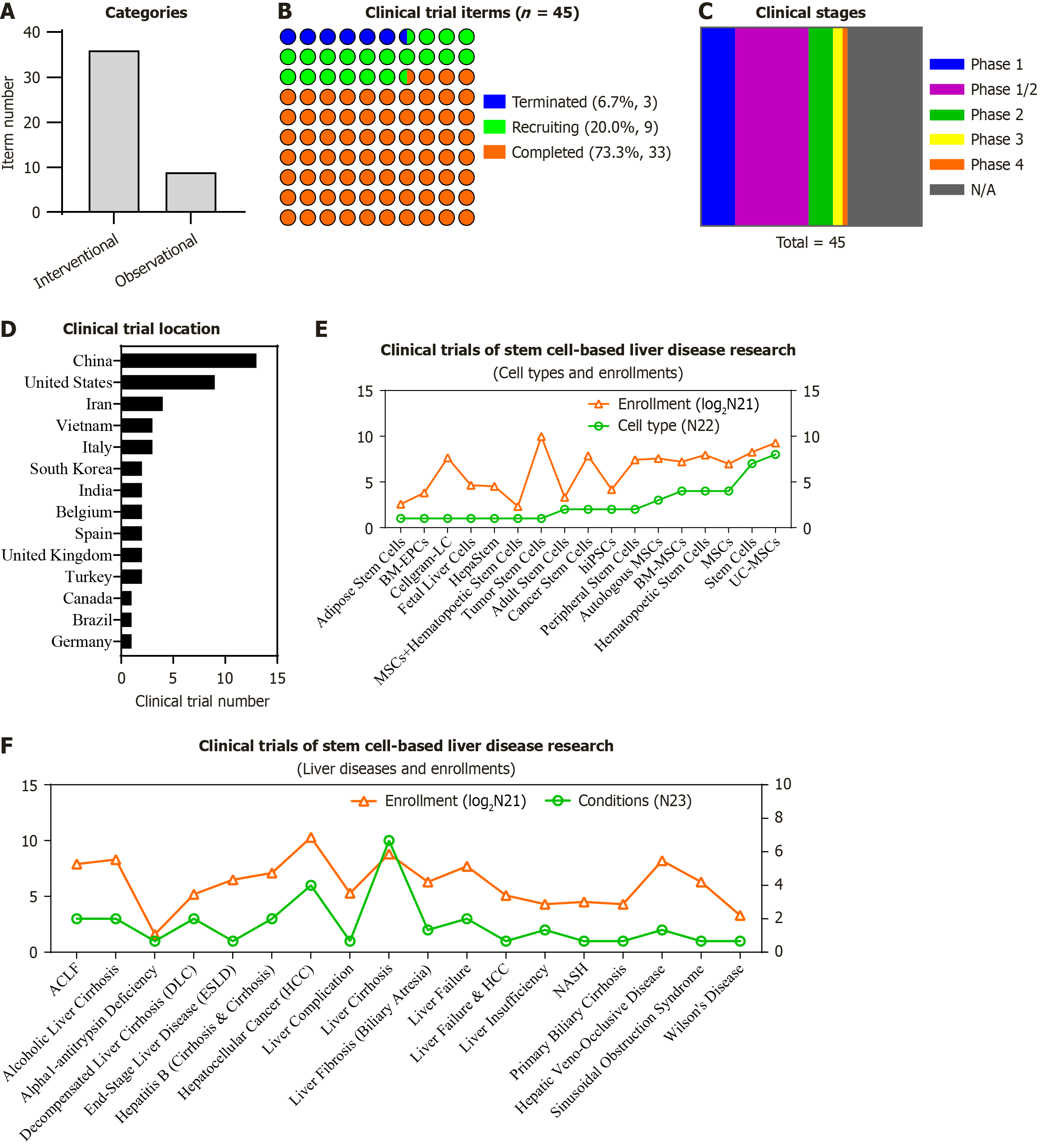A: The categories of the registered stem cell-based clinical trials for liver diseases according to ClinicalTrial.gov; B-D: The status, clinical stage and location of the abovementioned stem cell-based clinical trials; E and F: The distribution of stem cell-based clinical trials for liver diseases according to the enrolled participants [enrollment (Log2N21)] and the corresponding cell types (N22) or the clinical trial number [condition (N23)]. BM-EPCs: Bone marrow-derived endothelial progenitor cells; LC: Liver cells; MSCs: Mesenchymal stem/stromal cells; hiPSCs: Human induced pluripotent stem cells; BM-MSCs: Bone marrow-derived mesenchymal stem/stromal cells; UC-MSCs: Umbilical cord-derived mesenchymal stem/stromal cells; ACLF: Acute-on-chronic liver failure; NASH: Non-alcoholic steatohepatitis.