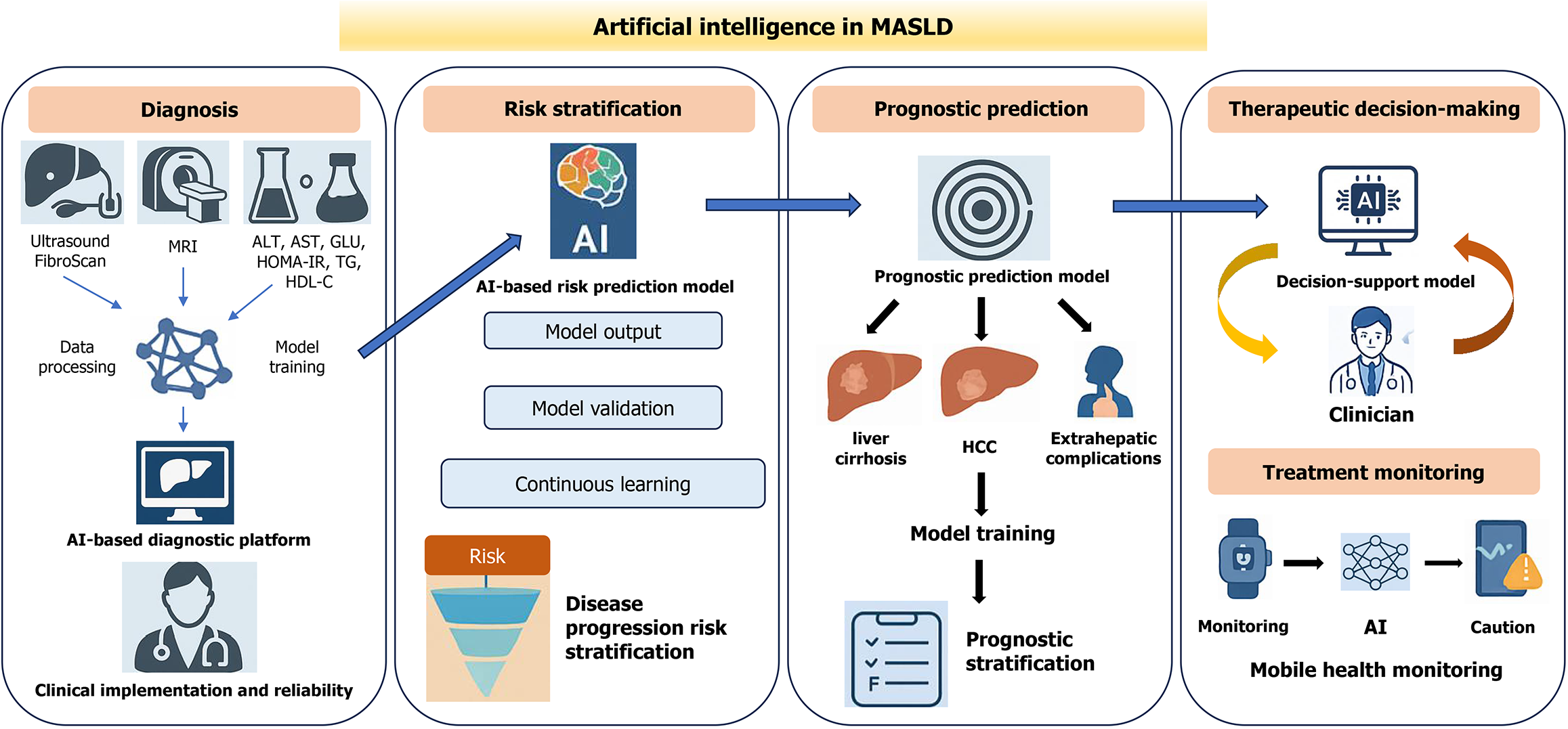 Diagnosis: Artificial intelligence (AI) models integrate biochemical indicators (alanine aminotransferase, aspartate aminotransferase, glucose, homeostatic model assessment of insulin resistance, triglycerides, high-density lipoprotein cholesterol) and multimodal imaging data (ultrasound, magnetic resonance imaging) for automatic detection and quantification of hepatic steatosis and fibrosis. Deep learning improves diagnostic accuracy, standardization, and efficiency, enabling non-invasive and early identification of metabolic dysfunction-associated steatotic liver disease. Risk stratification: Machine-learning algorithms combine clinical, imaging, and metabolic variables to predict the probability of advanced fibrosis, cirrhosis, or extrahepatic complications. AI-based risk maps provide individualized stratification for optimized referral and management pathways. Prognostic prediction: AI fusion models integrate longitudinal clinical and lifestyle data to forecast disease trajectories and long-term outcomes. Continuous learning frameworks (e.g., recurrent or transformer networks) enable dynamic prediction of fibrosis progression, hepatocellular carcinoma, and cardiovascular events. Therapeutic decision-making and treatment monitoring: AI-assisted systems analyze treatment responses and generate personalized lifestyle or pharmacologic recommendations. By incorporating wearable-device and mobile-health data, the platform enables real-time monitoring, adaptive feedback, and closed-loop management, improving adherence and long-term efficacy. AI: Artificial intelligence; ALT: Alanine aminotransferase; AST: Aspartate aminotransferase; GLU: Glucose; HCC: Hepatocellular carcinoma; HDL-C: High-density lipoprotein cholesterol; HOMA-IR: Homeostatic model assessment of insulin resistance; MASLD: Metabolic dysfunction-associated steatotic liver disease; MRI: Magnetic resonance imaging; TG: Triglycerides.