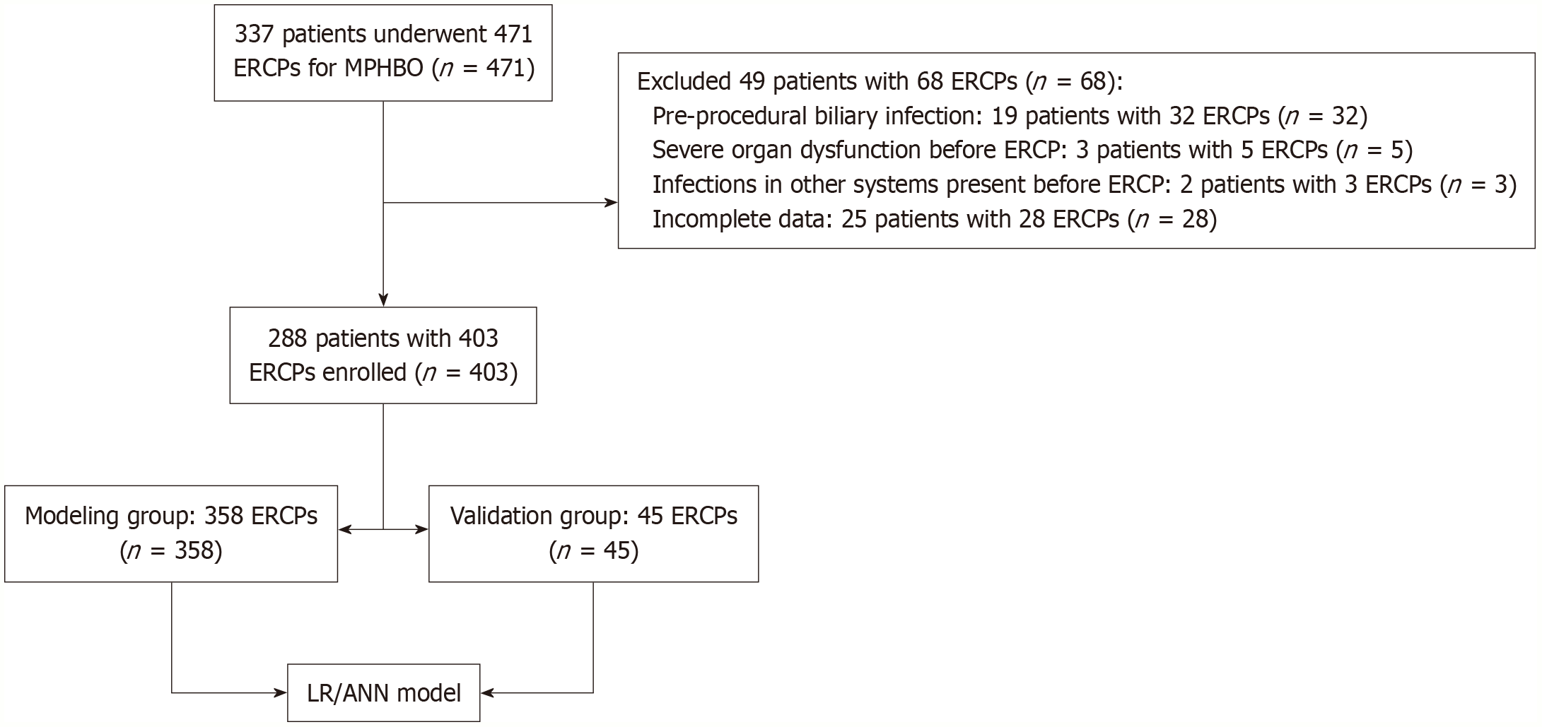 From January 2014 to October 2024, 337 patients with malignant perihilar biliary obstruction (MPHBO) successfully received 471 endoscopic retrograde cholangiopancreatography (ERCP) drainage procedures for MPHBO in three centers. Nineteen patients suffering from 32 ERCPs had pre-procedural biliary infection (n = 32); three individuals suffering from 5 ERCPs (n = 5) had severe organ dysfunction before ERCP; two of those enduring 3 ERCPs (n = 3) had infections in other systems present before ERCP; twenty-five individuals suffering from 28 ERCPs (n = 28) had incomplete data. After 49 patients enduring 68 ERCPs were excluded, 288 individuals suffering from 403 eligible ERCP clinical data were enrolled in the study. ANN: Artificial neural network; LR: Logistic regression.