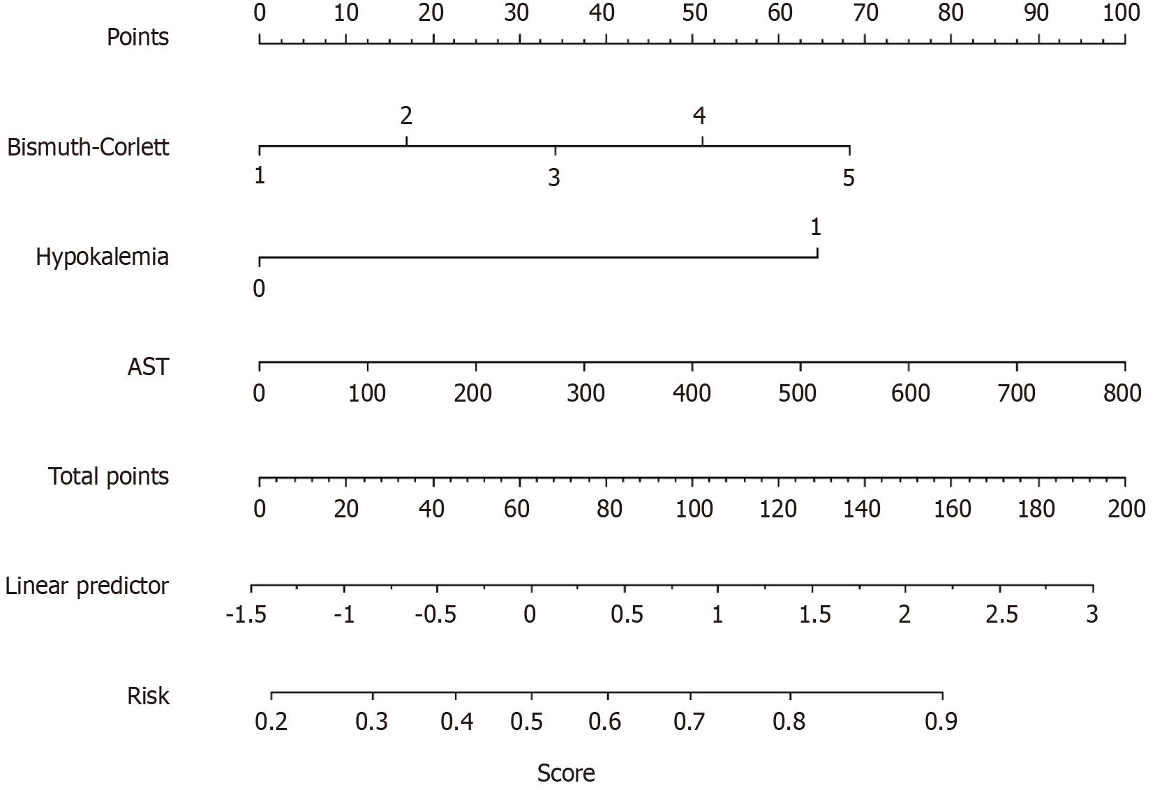 The nomogram illustrates the risk of postoperative biliary infection (PBI) in individuals suffering from malignant perihilar biliary obstruction who underwent endoscopic retrograde cholangiopancreatography. To apply it, the clinician identifies the patient’s value on each variable axis and draws a line upward to assign points for that variable. After summing the points across all variables, the total is located on the overall points axis. From there, a line is drawn downward to the risk scale to estimate the probability of PBI. In this nomogram, a patient with hypokalemia is shown as 1 and the case without is denoted as 0; in the Bismuth-Corlett classification, “3” denotes type IIIa, “4” symbolizes type IIIb and “5” defines type IV. AST: Aspartate transaminase.