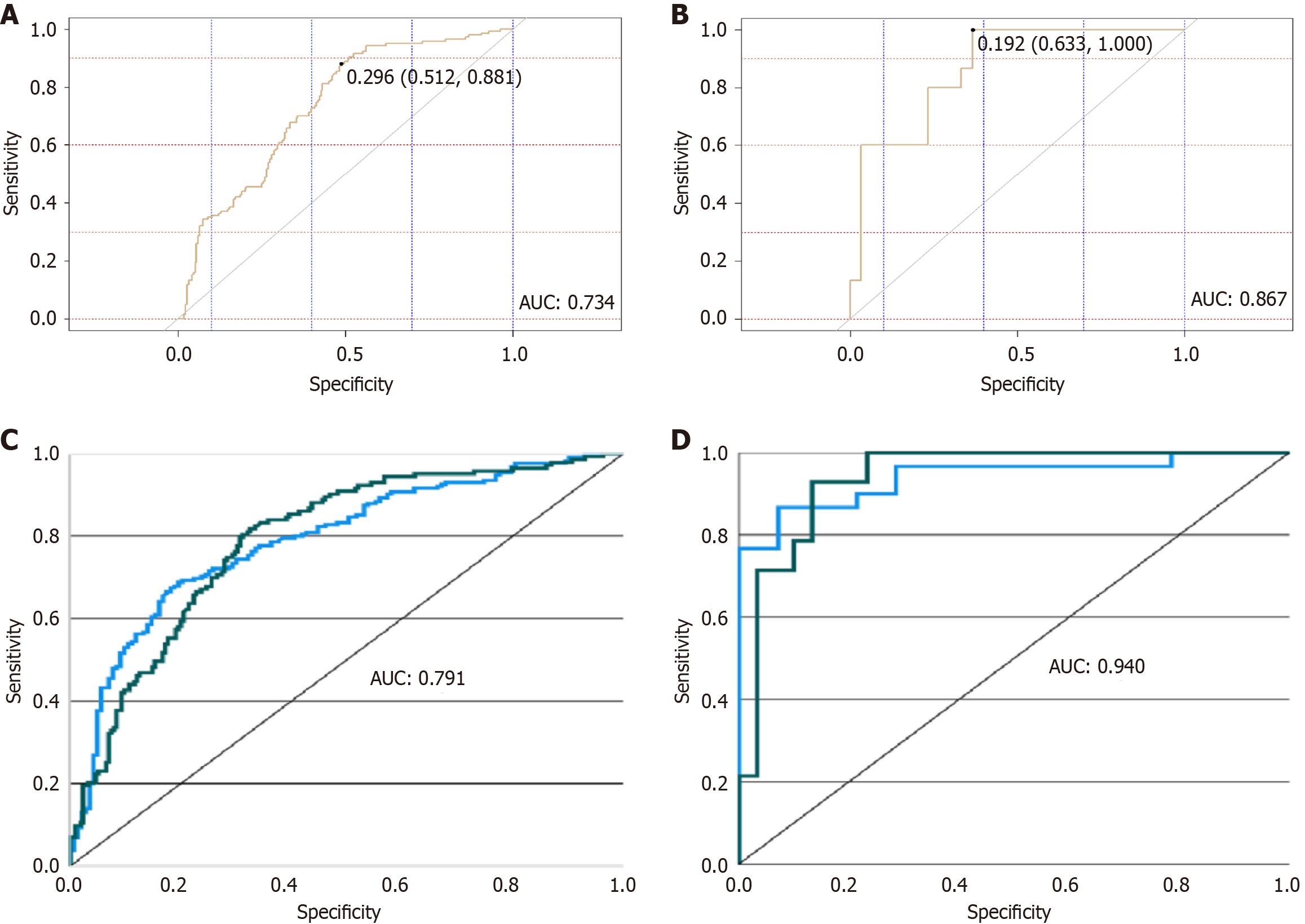 A: Receiver operating characteristic (ROC) curve for the logistic regression (LR) modeling group; B: ROC curve for the LR validation group; C: ROC curve for the artificial neural network (ANN) modeling group; D: ROC curve for the ANN validation group. AUC: Area under the curve.