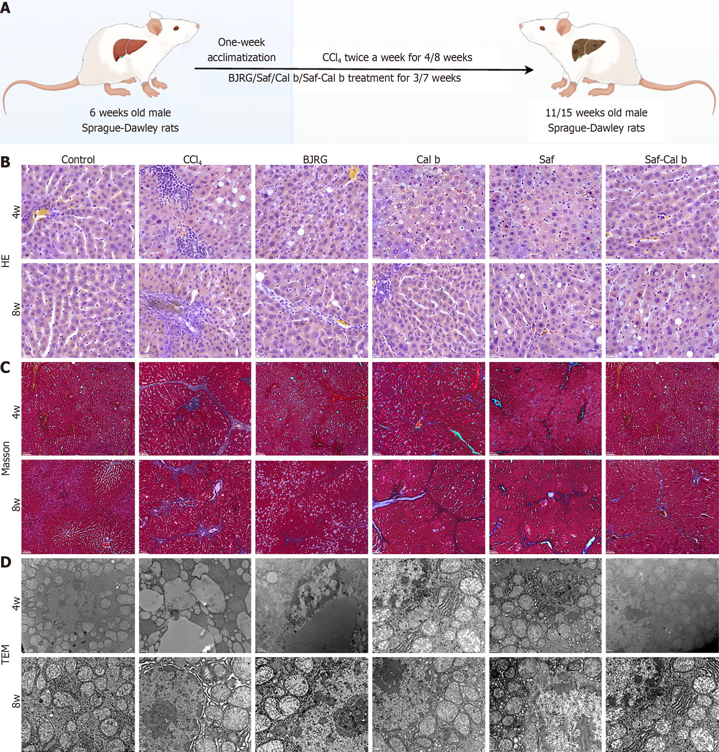 A: An overview of the experimental protocol is shown. Six-week-old rats received CCl4 gavage for 4 weeks and 8 weeks, with concurrent drug administration initiated on the second week of gavage; B: Hematoxylin and eosin staining (scale bar: 100 μm); C: Masson’s staining (scale bar: 100 μm) of liver tissue from the indicated groups; D: Transmission electron microscopy was performed to examine the ultrastructure of liver tissue (scale bar: 500 nm). Note: In this study, “4w” and “8w” are defined as the 4th and 8th week, respectively, after the initial CCl4 treatment. BJRG: Biejia Ruangan tablet; Saf: Saffron; Cal b: Calculus bovis; HE: Hematoxylin and eosin; TEM: Transmission electron microscopy.