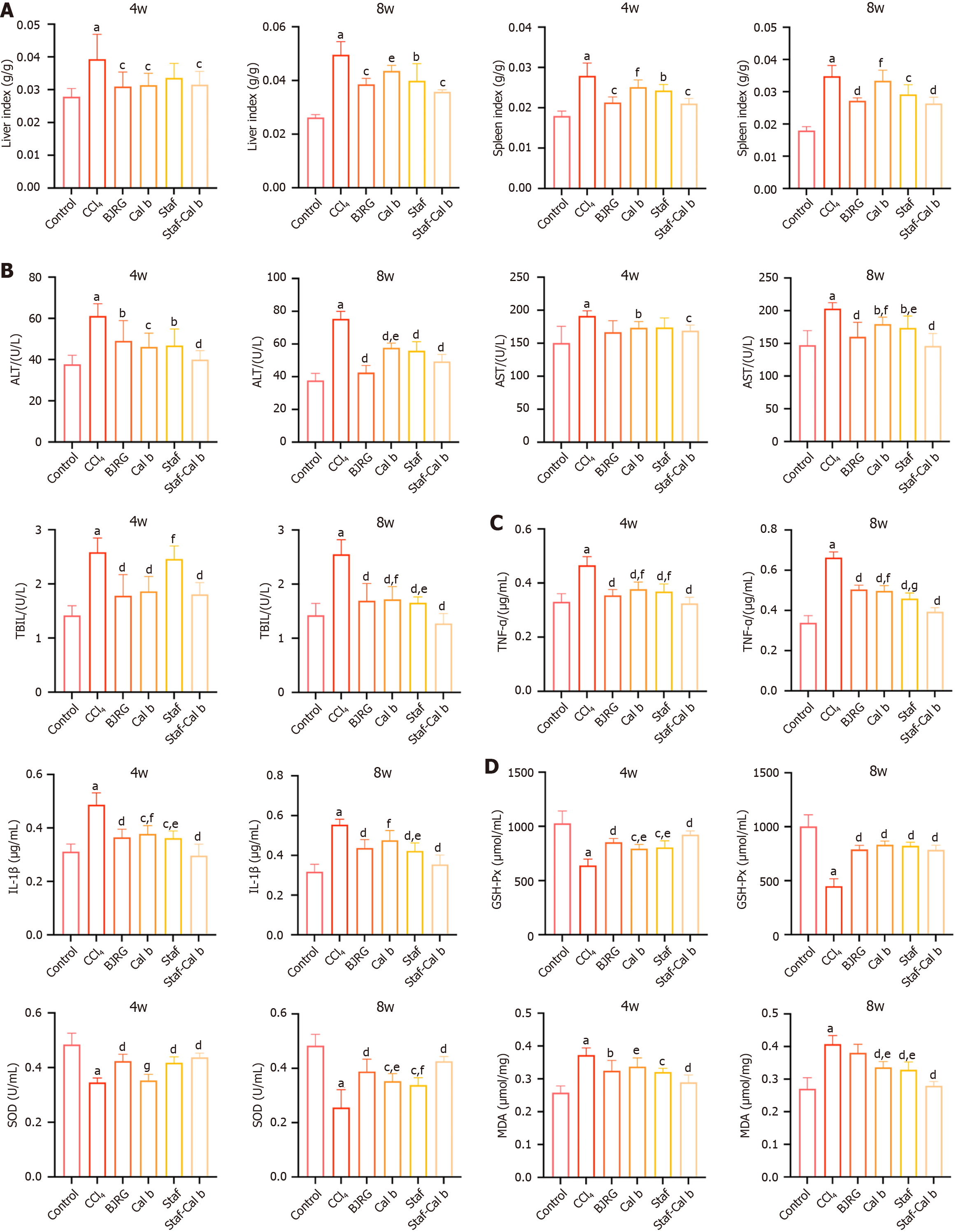 A and B: Serum aspartate aminotransferase, alanine aminotransferase, and total bilirubin activities; C: Serum tumor necrosis factor-α and interleukin-1β levels; D: Glutathione peroxidase, superoxide dismutase and malondialdehyde concentration in the liver in the indicated groups. Data are shown as mean ± SD (n = 6). BJRG: Biejia Ruangan tablet; Saf: Saffron; Cal b: Calculus bovis; ALT: Alanine aminotransferase; AST: Aspartate aminotransferase; TBIL: Total bilirubin; TNF: Tumor necrosis factor; IL: Interleukin; GSH-PX: Glutathione peroxidase; SOD: Superoxide dismutase; MDA: Malondialdehyde. aP < 0.001 vs control group, bP < 0.05 vs CCl4 group, cP < 0.01 vs CCl4 group, dP < 0.001 vs CCl4 group, eP < 0.05 vs saffron and Calculus bovis group, fP < 0.01 vs saffron and Calculus bovis group, and gP < 0.001 vs saffron and Calculus bovis group.