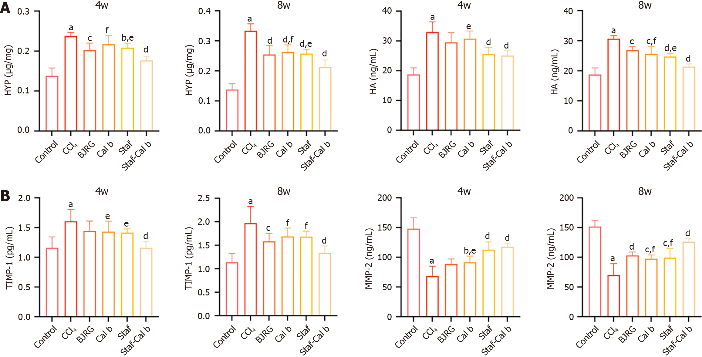 A: Hydroxyproline content in rat liver tissue and hyaluronic acid level in serum at 4 weeks and 8 weeks; B: Tissue inhibitors of metalloproteinases-1 and matrix metalloproteinase-2 content in rat liver tissues at 4 weeks and 8 weeks. Data are shown as mean ± SD (n = 6). BJRG: Biejia Ruangan tablet; Saf: Saffron; Cal b: Calculus bovis; HYP: Hydroxyproline; HA: Hyaluronic acid; TIMP: Tissue inhibitors of metalloproteinases; MMP: Matrix metalloproteinase. aP < 0.001 vs control group, bP < 0.05 vs CCl4 group, cP < 0.01 vs CCl4 group, dP < 0.001 vs CCl4 group, eP < 0.05 vs saffron and Calculus bovis group, and fP < 0.01 vs saffron and Calculus bovis group.