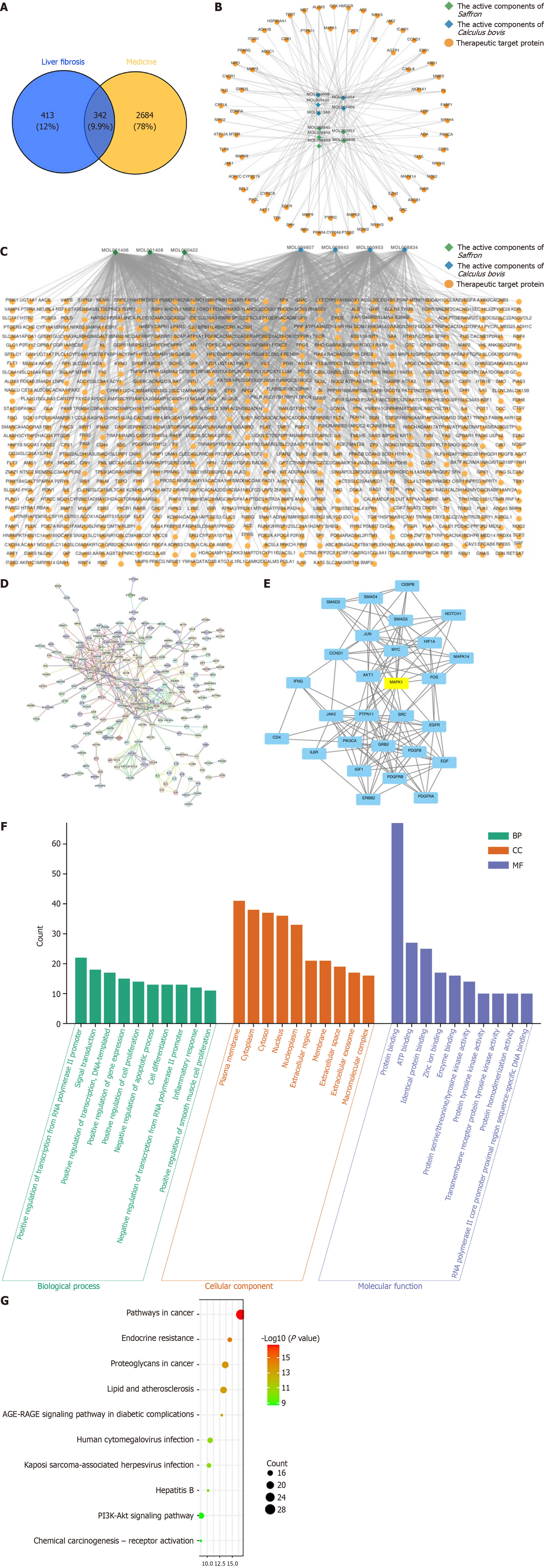 A: Venn diagram of overlapping targets of saffron and Calculus bovis (Saf-Cal b) in the treatment of hepatic fibrosis; B: Network diagram of active ingredients and targets of Saf-Cal b in the Traditional Chinese Medicine Systems Pharmacology Database and Analysis Platform database; C: Network diagram of active ingredients and targets of Saf-Cal b in the Bioinformatics Annotation Database for Molecular Mechanism of Traditional Chinese Medicine database; D: Protein-protein interaction network; E: Core clustering network; F: Bar chart of Gene Ontology functional enrichment analysis (biological processes, cellular components, molecular function) of targets of Saf-Cal b in the treatment of hepatic fibrosis; G: Bubble chart of Kyoto Encyclopedia of Genes and Genomes pathway analysis of targets of Saf-Cal b in treating hepatic fibrosis. BP: Biological processes; CC: Cellular components; MF: Molecular functions; PI3K-Akt: Phosphatidylinositol 3-kinase/protein kinase B.