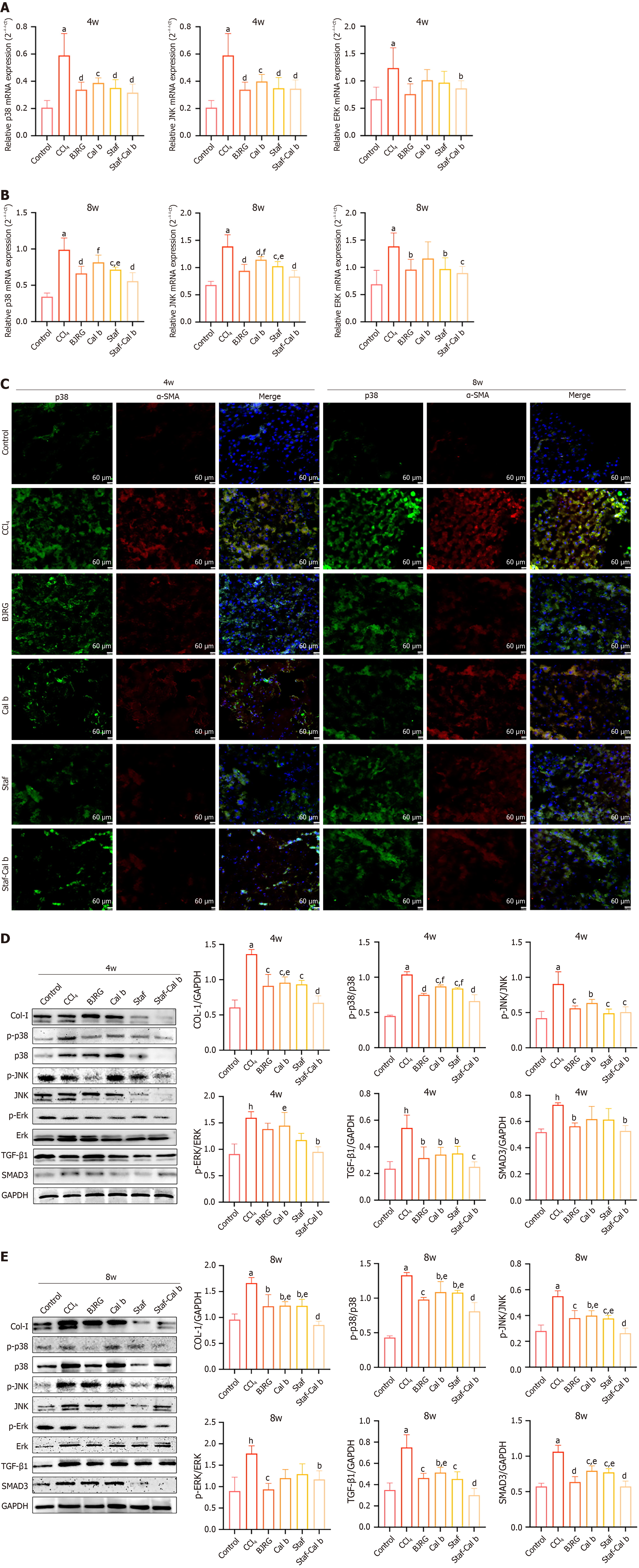 A: Effects of each drug on mRNA levels of p38 mitogen-activated protein kinase, c-Jun N-terminal kinases, and extracellular signal-regulated kinase at 4 weeks; B: Effects of each drug on mRNA levels of p38 mitogen-activated protein kinase, c-Jun N-terminal kinases, and extracellular signal-regulated kinase at 8 weeks; C: Immunofluorescence results of p38 and α-smooth muscle actin in rat liver tissues at 4 weeks and 8 weeks; D: Protein expression of type I collagen, phosphorylated-p38, phosphorylated c-Jun N-terminal kinases, phospho rylated extracellular signal-regulated kinase, transforming growth factor-β, and mothers against decapentaplegic homolog 3 in each group at 4 weeks; E: Protein expression of type I collagen, phosphorylated-p38, phosphorylated c-Jun N-terminal kinases, phosphorylated extracellular signal-regulated kinase, transforming growth factor-β, and mothers against decapentaplegic homolog 3 in each group at 8 weeks. α-SMA: Α-smooth muscle actin; COI-I: Type I collagen; TGF-β: Transforming growth factor-β; SMAD3: Mothers against decapentaplegic homolog 3; BJRG: Biejia Ruangan tablet; Saf: Saffron; Cal b: Calculus bovis; JNK: C-Jun N-terminal kinases; ERK: Extracellular signal-regulated kinase; GAPDH: Glyceraldehyde 3-phosphate dehydrogenase. aP < 0.001 vs control group, bP < 0.05 vs CCl4 group, cP < 0.01 vs CCl4 group, dP < 0.001 vs CCl4 group, eP < 0.05 vs saffron and Calculus bovis group, and fP < 0.01 vs saffron and Calculus bovis group.