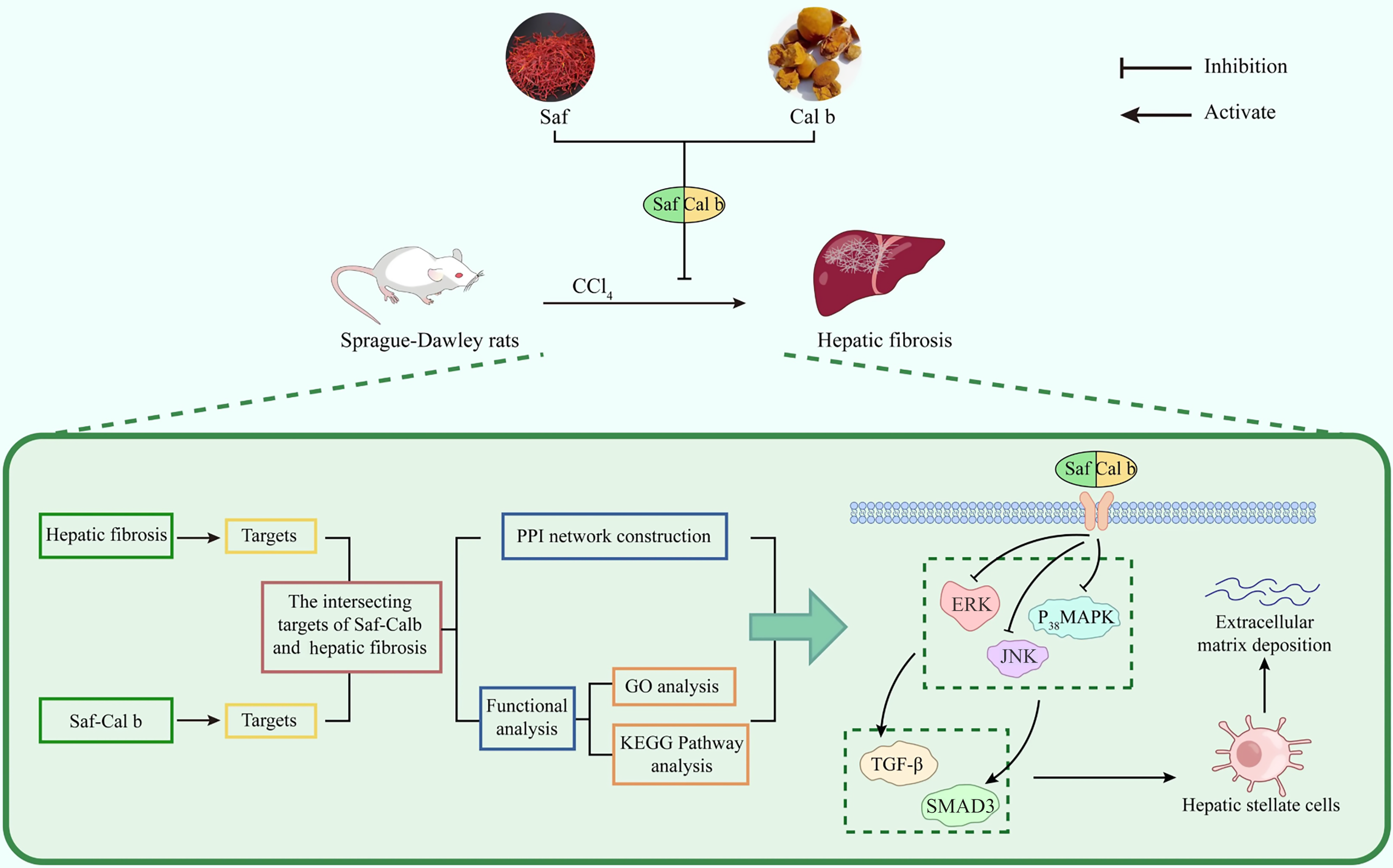 Saf: Saffron; Cal b: Calculus bovis; PPI: Protein-protein interactions; GO: Gene Ontology; KEGG: Kyoto Encyclopedia of Genes and Genomes; ERK: Extracellular signal-regulated kinase; MAPK: Mitogen-activated protein kinase; JNK: C-Jun N-terminal kinases; TGF-β: Transforming growth factor-β; SMAD3: Mothers against decapentaplegic homolog 3.