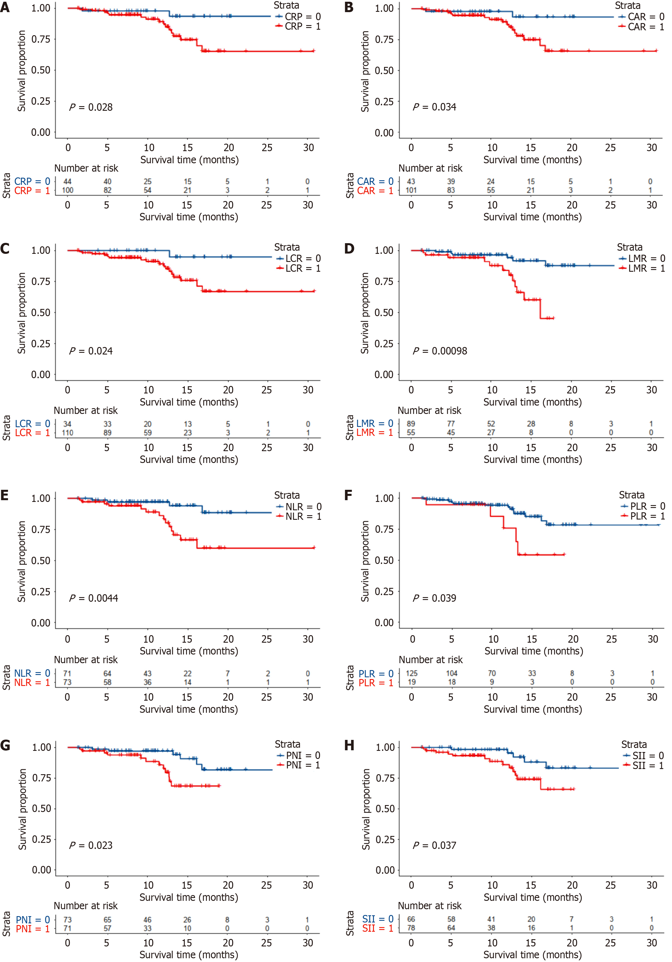 A: C-reactive protein; B: C-reactive protein-to-albumin ratio; C: Lymphocyte-to-C-reactive protein ratio; D: Lymphocyte-to-monocyte ratio; E: Neutrophil-to-lymphocyte ratio; F: Platelet-to-lymphocyte ratio; G: Prognostic nutritional index; H: Systemic immune-inflammation index. CRP: C-reactive protein; PLR: Platelet-to-lymphocyte ratio; NLR: Neutrophil-to-lymphocyte ratio; LCR: Lymphocyte-to-C-reactive protein ratio; LMR: Lymphocyte-to-monocyte ratio; SII: Systemic immune-inflammation index; CAR: C-reactive protein-to-albumin ratio; PNI: Prognostic nutritional index.