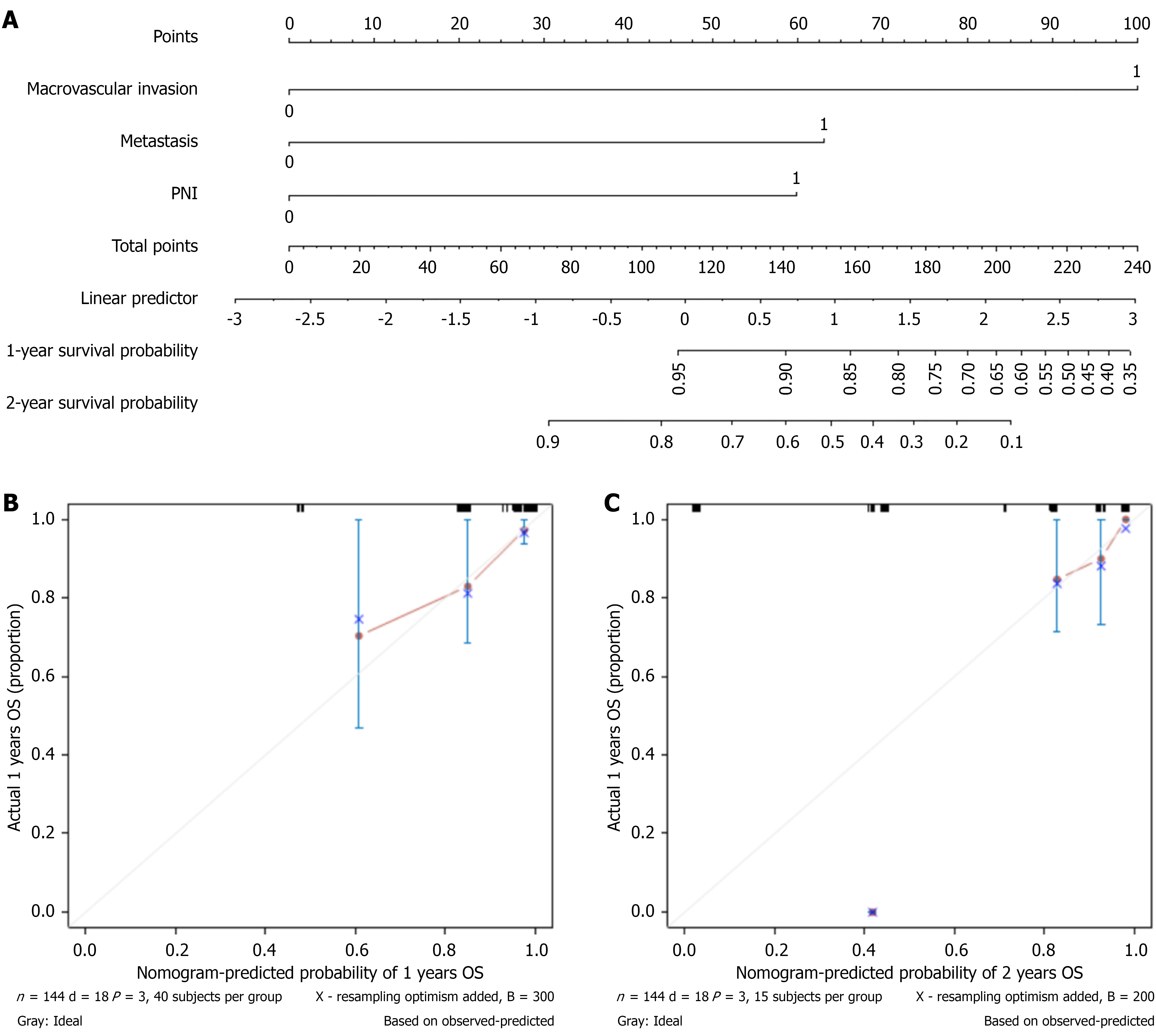 A: Nomogram for predicting the probability of 1- and 2-year overall survival (OS) in hepatocellular carcinoma patients after Lenvatinib therapy; B: Calibration curve for predicting patient OS at 1 year; C: Calibration curve for predicting patient OS at 2 years. OS: Overall survival; PNI: Prognostic nutritional index.