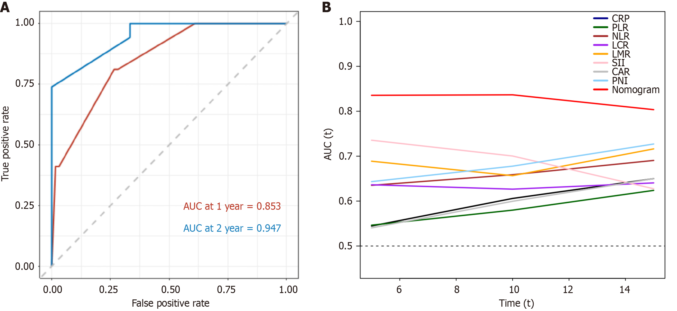 A: The area under the curve (AUC) values for time-dependent receiver operating characteristic curves verified the prognostic accuracy of the nomogram; B: Time-dependent AUC plot of survival predicted by the inflammation-based scores and the nomogram. AUC: Area under the curve.