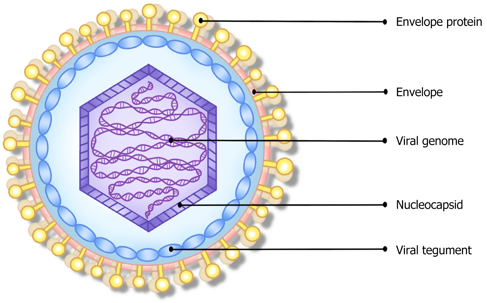 The virus particle consists of the envelope protein on the outermost layer, followed by the envelope. Beneath the envelope is the viral tegument. Inside, the nucleocapsid encloses the viral genome, which carries the virus's genetic information.