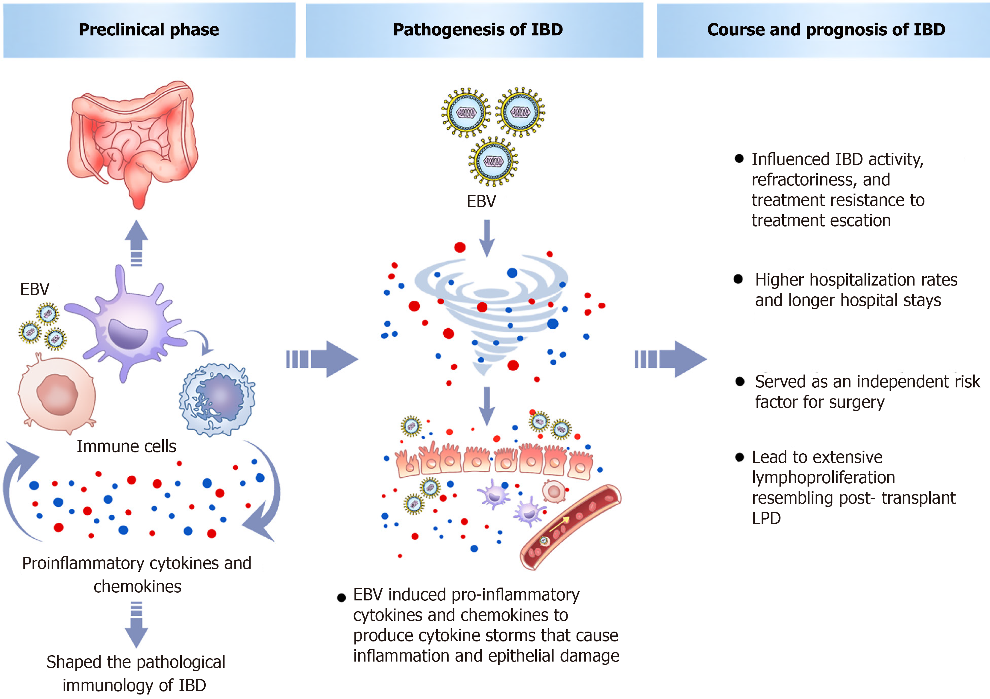 It is divided into three parts: The preclinical phase, where Epstein-Barr virus (EBV) interacts with immune cells and proinflammatory cytokines/chemokines to shape inflammatory bowel disease’s (IBD's) pathological immunology; the pathogenesis of IBD, in which EBV induces pro-inflammatory cytokines and chemokines, causing cytokine storms that result in inflammation and epithelial damage; and the course and prognosis of IBD, where EBV influences IBD activity, refractoriness, and treatment resistance, increases hospitalization rates and duration, acts as an independent risk factor for surgery, and leads to extensive lymphoproliferation resembling post - transplant lymphoproliferative disorder (LPD). EBV: Epstein-Barr virus; IBD: Inflammatory bowel disease; LPD: Lymphoproliferative disorder.
