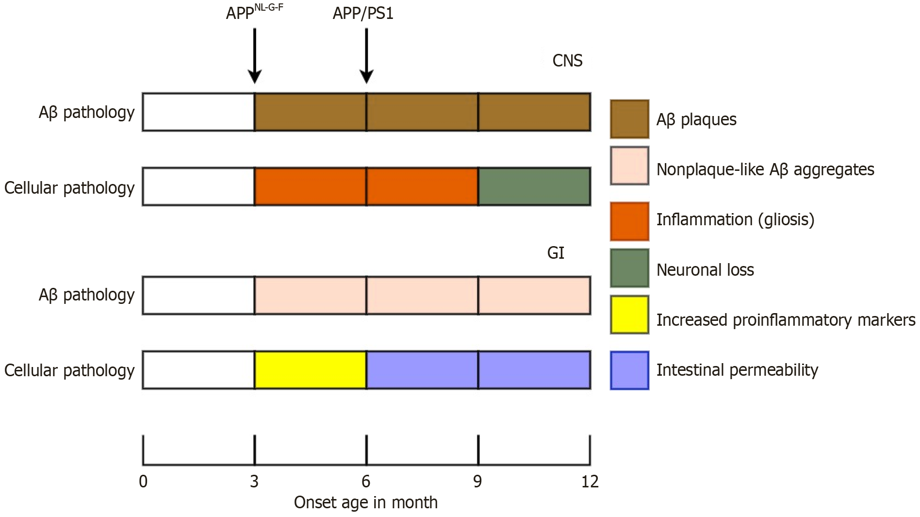 Figure 1 This schematic timeline illustrates the progression of Alzheimer’s disease-related pathologies in the central nervous system and gastrointestinal tracts of APPNL-G-F and amyloid precursor protein/PS1 transgenic mouse models.