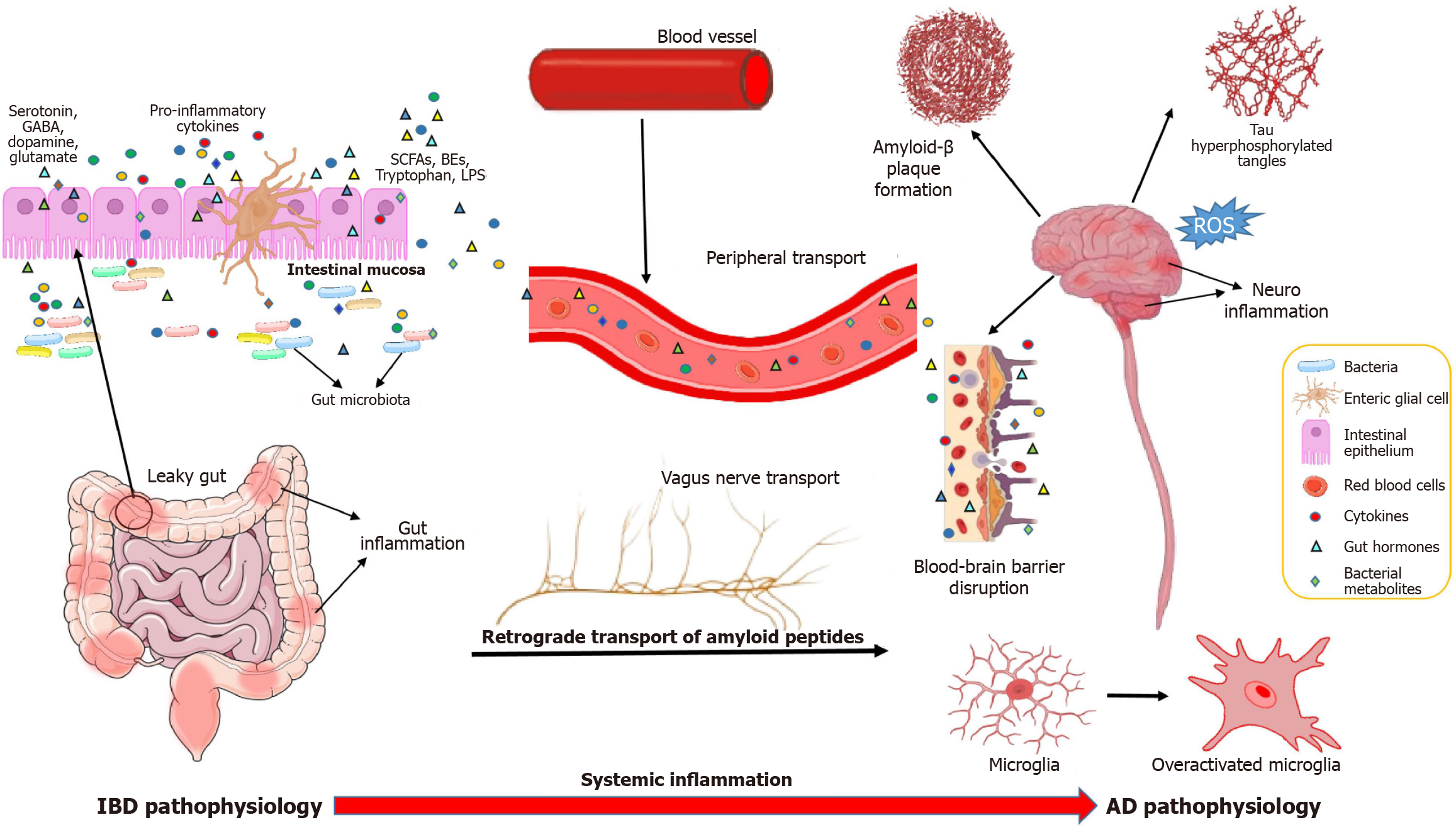 Figure 2 Detailed schematics of inflammatory bowel disease pathophysiology and its transformation into Alzheimer’s disease pathophysiology: Gut inflammation and increased intestinal permeability lead to systemic transport of inflammatory mediators via peripheral circulation and vagus nerve, resulting in blood-brain barrier disruption, amyloid-β accumulation, tau hyperphosphorylation, and neuroinflammation.