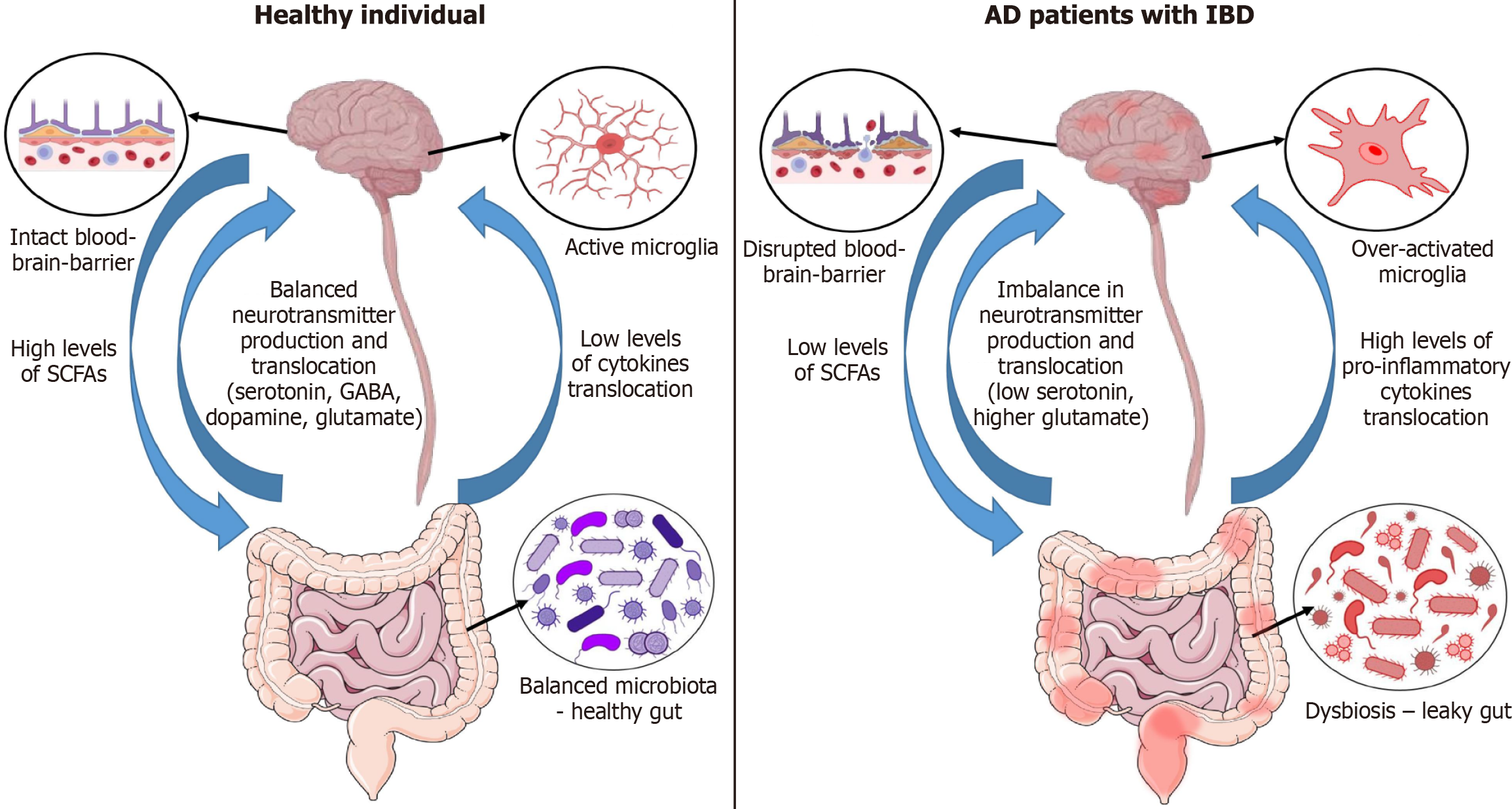 Figure 3 Gut-brain axis comparison between healthy individuals and Alzheimer's disease patients with inflammatory bowel disease.