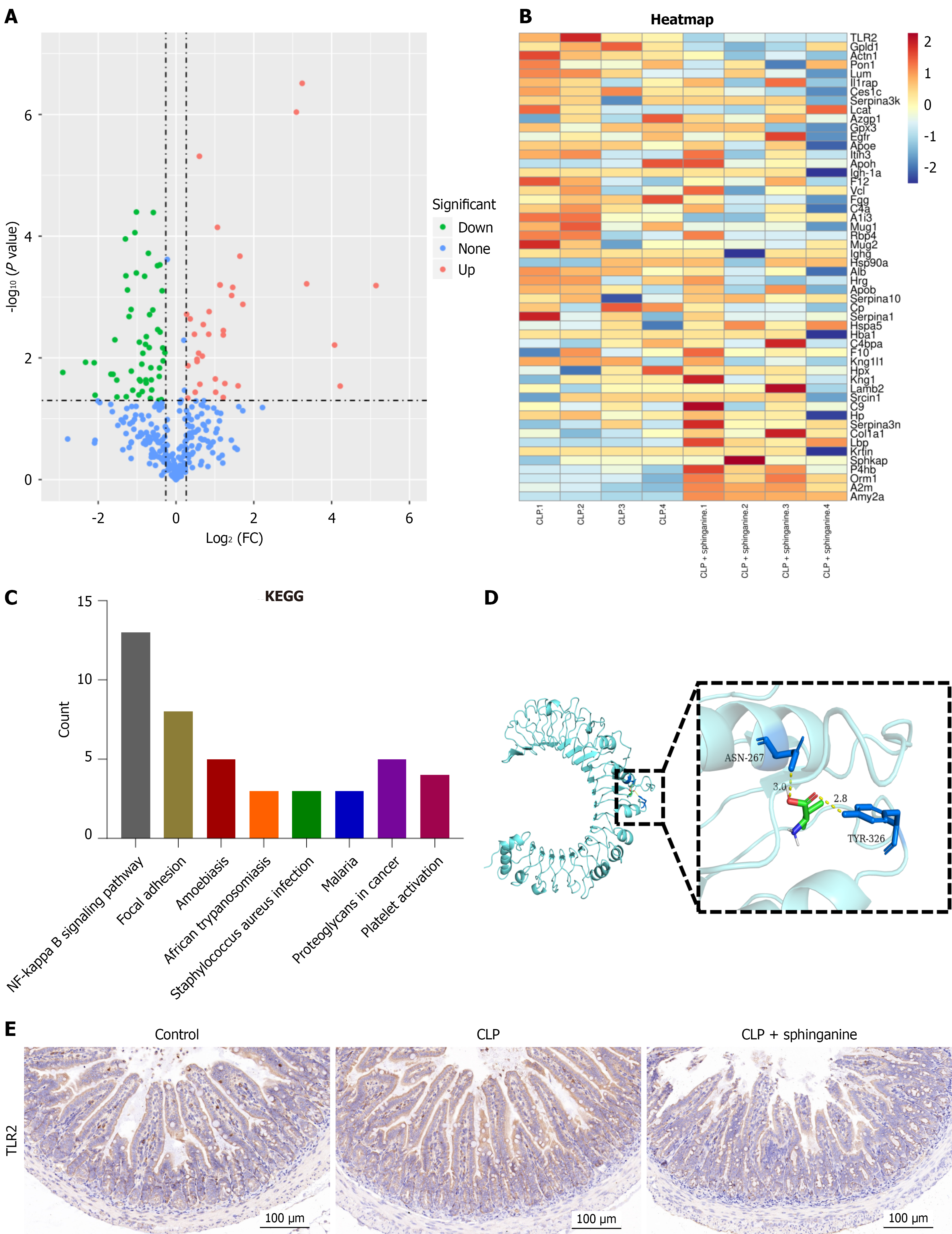 A: Volcano plot showing differentially expressed proteins in intestine samples from the lipopolysaccharide (LPS) and LPS + sphinganine groups analyzed by label-free proteomics; B: Heat map summarizing the relative abundance of proteins, highlighting toll like receptor (TLR) 2 as the most significantly altered protein between the two groups; C: Kyoto Encyclopedia of Genes and Genomes pathway analysis indicated that the nuclear factor kappa-B signaling pathway was the most significantly enriched; D: Docking results showed a binding energy of -4.3 kcal/mol between sphinganine and the TLR2 protein, suggesting a potential interaction; E: Immunohistochemical staining of TLR2 in colon tissue samples. TLR2 expression was increased in sepsis model mice, and sphinganine treatment significantly reduced this upregulation. FC: Fold change; TLR2: Toll like receptor 2; KEGG: Kyoto Encyclopedia of Genes and Genomes; CLP: Cecal ligation and puncture.