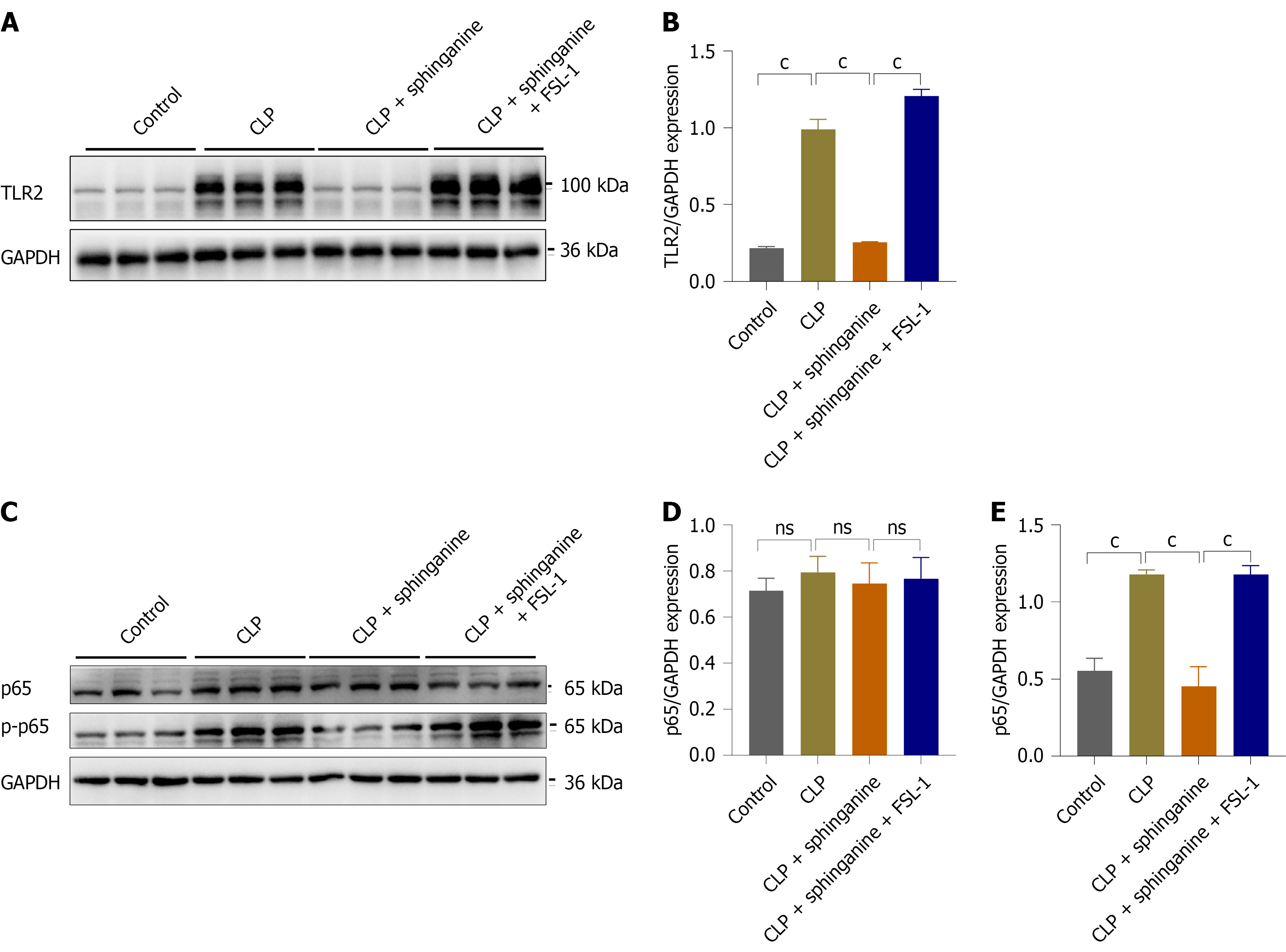 A-E: Representative Western blot images and quantitative analysis of phosphorylated p65 and total p65 protein expression in colon tissues from different groups of mice (n = 3 per group). Data are presented as mean ± SEM. cP < 0.001. TLR2: Toll like receptor 2; GAPDH: Glyceraldehyde-3-phosphate dehydrogenase; CLP: Cecal ligation and puncture; FSL-1: Fibroblast-stimulating lipopeptide-1; ns: Not significant; p-p65: Phosphorylated p65.