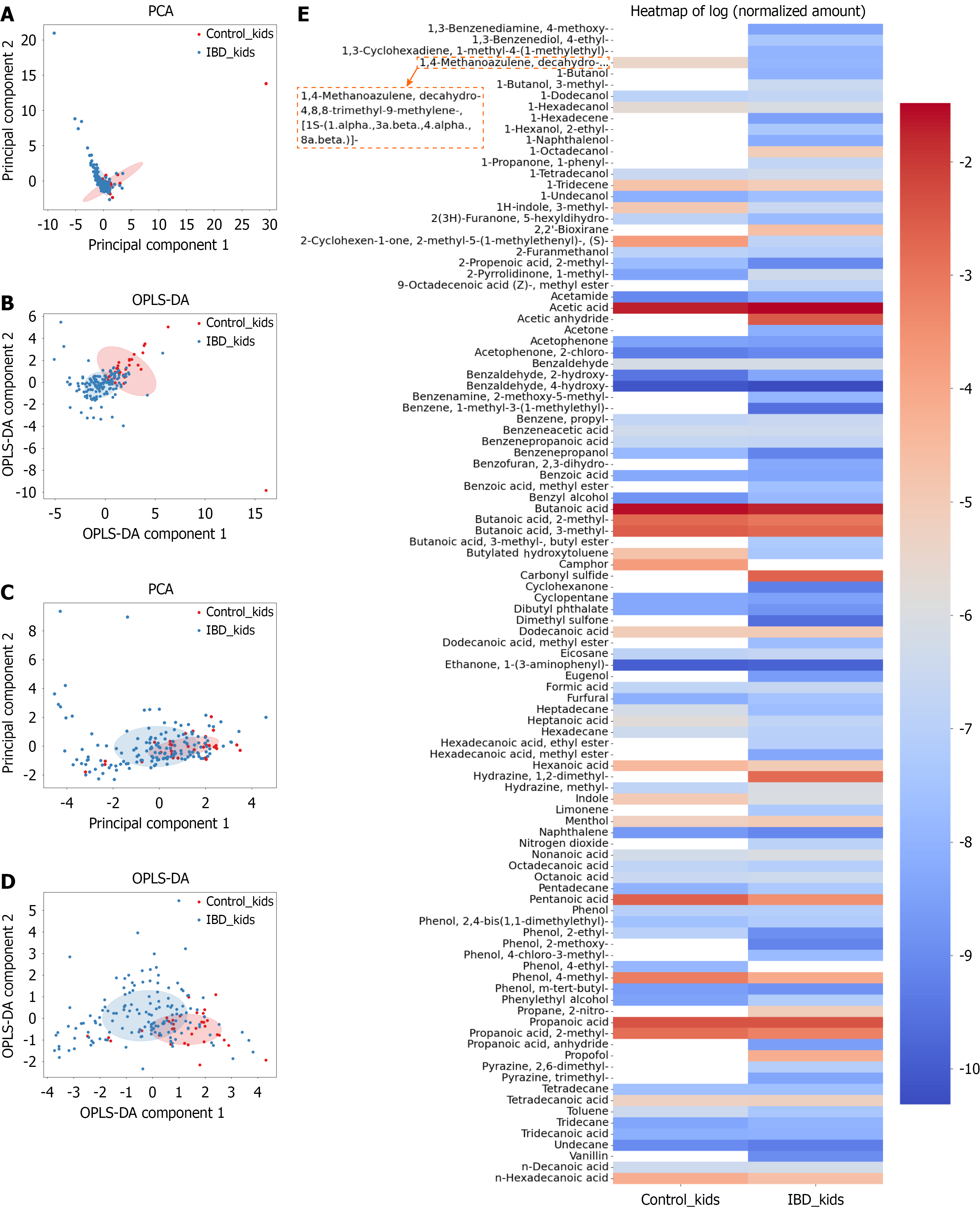 A and B: Principal component analysis and Orthogonal Partial Least Squares Discriminant Analysis data represent two independent groups of samples [inflammatory bowel disease (IBD) kids and control kids] according to the relative concentration of all detected volatile compounds; C and D: Principal component analysis and Orthogonal Partial Least Squares Discriminant Analysis data represent two independent groups of samples (IBD kids and control kids) according to the relative concentration of stable detected volatile compounds; E: Comparison of volatile organic compound composition for two independent groups of samples (IBD kids and control kids). Relative concentrations in the vapor phase were used. PCA: Principal component analysis; IBD: Inflammatory bowel disease; OPLS-DA: Orthogonal Partial Least Squares Discriminant Analysis.