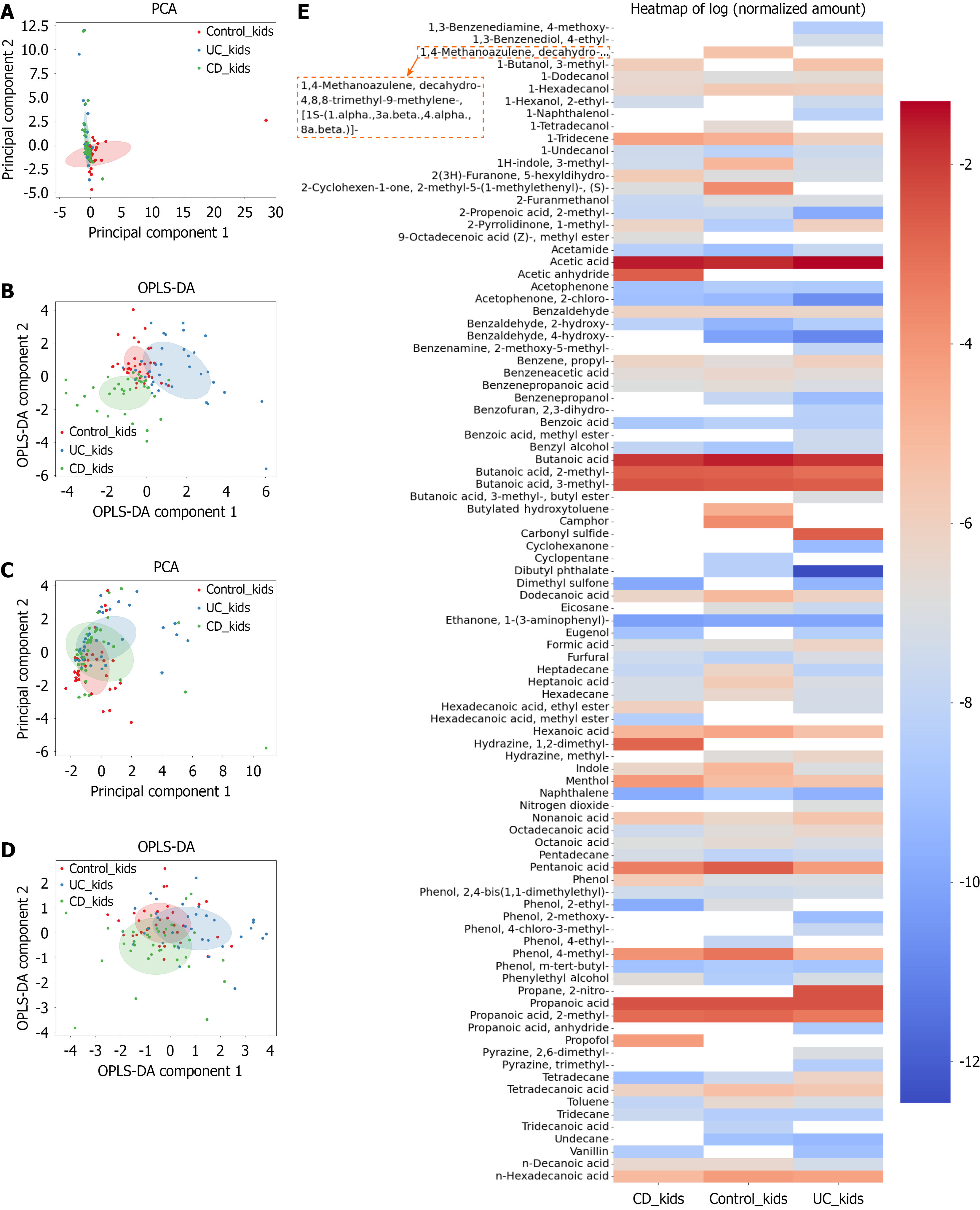 A and B: Principal component analysis and Orthogonal Partial Least Squares Discriminant Analysis data represent three in dependent groups of samples [ulcerative colitis (UC) kids, Crohn’s disease (CD)-kids, and control kids] according to the relative concentration of all detected volatile compounds; C and D: Principal component analysis and Orthogonal Partial Least Squares Discriminant Analysis data represent three independent groups of samples (UC kids, CD-kids, and control kids) according to the relative concentration of stable detected volatile compounds; E: Comparison of volatile organic compound composition for three independent groups of samples (UC kids, CD-kids, and control kids). Relative concentrations in the vapor phase were used. UC: Ulcerative colitis; CD: Crohn’s disease; PCA: Principal component analysis; IBD: Inflammatory bowel disease; OPLS-DA: Orthogonal Partial Least Squares Discriminant Analysis.