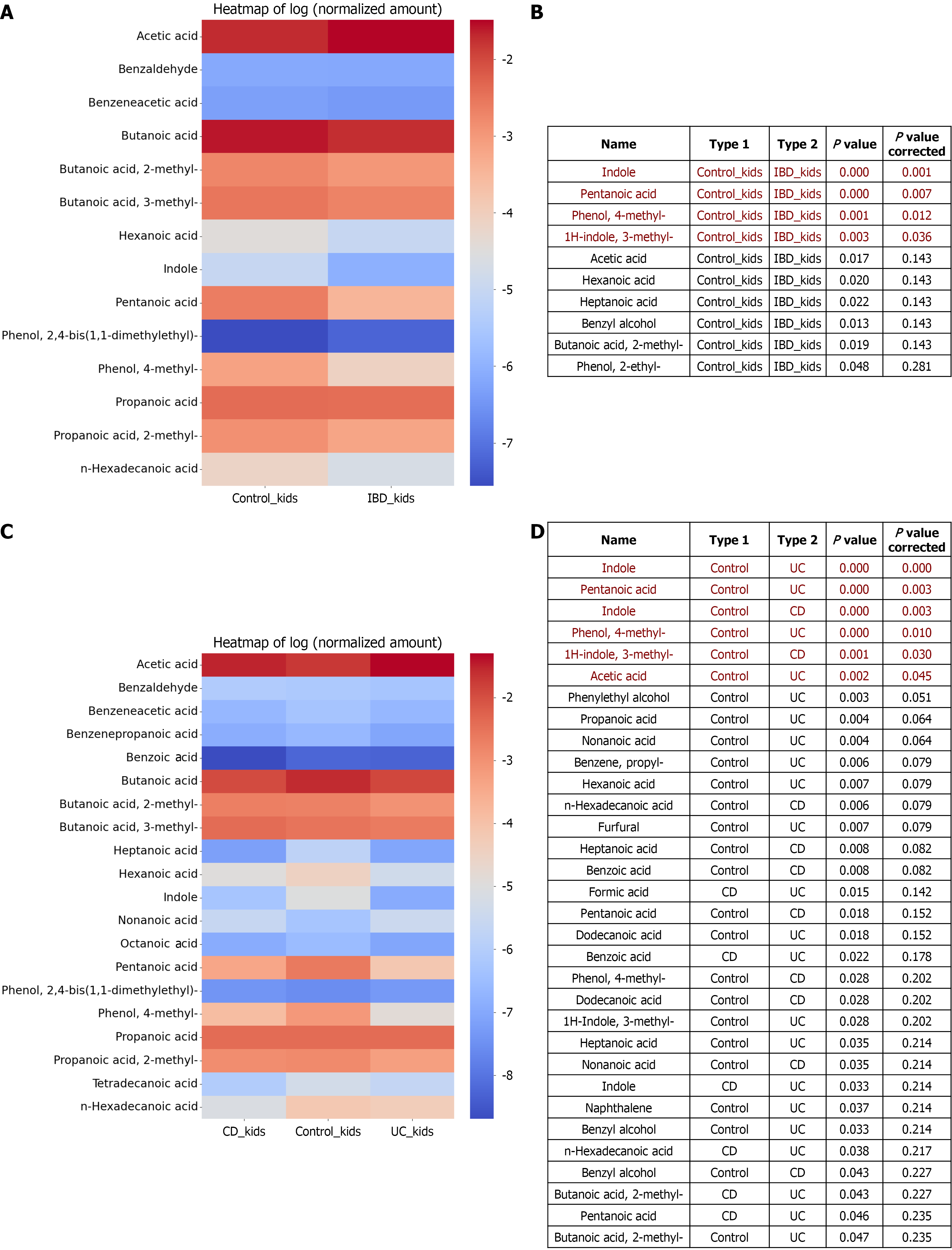 A: Comparison of the volatile organic compound composition of stable detected metabolites for two independent groups of samples (inflammatory bowel disease kids and control kids). Relative concentrations in the vapor phase were used; B: The nonparametric Mann-Whitney test was used for the primary comparisons between groups, inflammatory bowel disease kids, and Control kids. Statistical significance was determined by a two-sided P-value of less than 0.05. False discovery rate correction was also applied; C: Comparison of the volatile organic compound composition of stable detected metabolites for three independent groups of samples (ulcerative colitis kids, Crohn’s disease kids, and control kids). Relative concentrations in the vapor phase were used; D: The nonparametric Mann-Whitney test was used for the primary comparisons between groups: Ulcerative colitis kids, Crohn’s disease kids, and control kids. Statistical significance was determined by a two-sided P-value of less than 0.05. False discovery rate correction was also applied. UC: Ulcerative colitis; CD: Crohn’s disease; IBD: Inflammatory bowel disease.