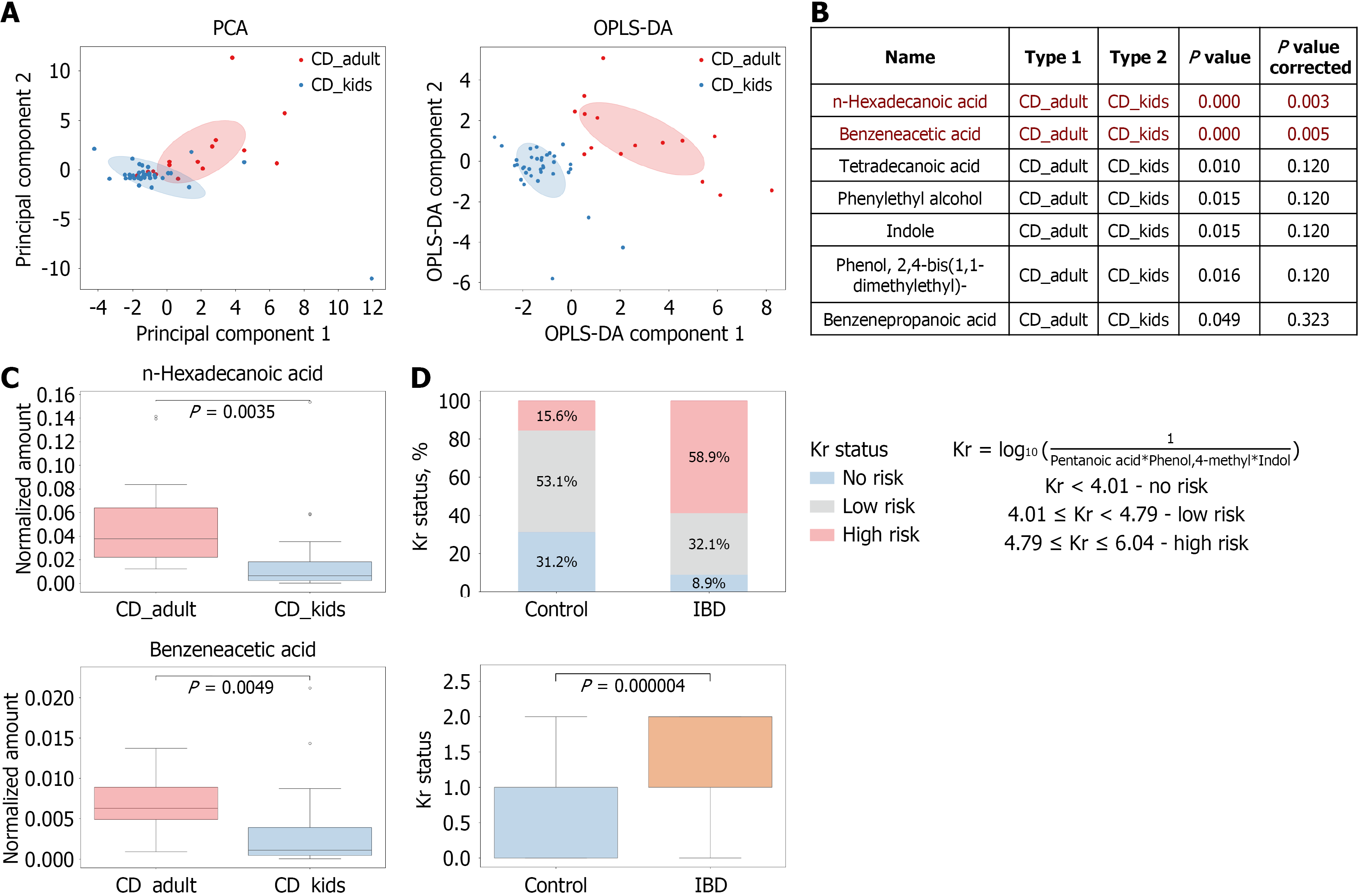 A: Principal component analysis and Orthogonal Partial Least Squares Discriminant Analysis data represent two independent groups of samples [Crohn’s disease (CD)-kids, CD-adults]. According to the relative concentration of all detected volatile compounds; B: The nonparametric Mann-Whitney test was used for the primary comparisons between groups. Statistical significance was determined by a two-sided P-value of less than 0.05. False discovery rate correction was also applied; C: Box plots the quantitative differences in the relative contents of metabolites detected in the analyzed groups (CD-kids, CD-adults); D: Risk coefficient calculation. UC: Ulcerative colitis; CD: Crohn’s disease; PCA: Principal component analysis; IBD: Inflammatory bowel disease; OPLS-DA: Orthogonal Partial Least Squares Discriminant Analysis.